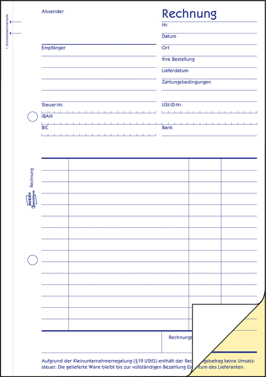 Die Rechnung für Kleinunternehmer 1733 von AVERY ZWECKFORM im DIN A5 Format ist zur Verwendung speziell durch Kleinunternehmer gemäß §19 des Umsatzsteuergesetzes (UStG) geeignet, da Kleinunternehmer in ihren Rechnungen keine Mehrwertsteuer ausweisen dürfen. Das Rechnungsbuch beinhaltet 40 vorgedruckte Rechnungsvorlagen mit jeweils einem selbstdurchschreibenden, gelben Durchschlag. Die Rechnungsvorlagen und Vordrucke von Avery Zweckform sind zuverlässige, bewährte Hilfen für Ihre Warenwirtschaft, Buchhaltung und Steuer und werden regelmäßig von Rechtsexperten geprüft.
