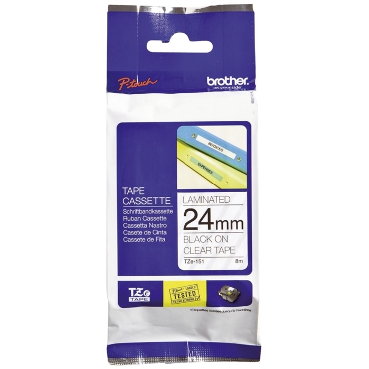 Schriftbandkassette TZE151. Material: laminiert ausgeführt. Größe (L x B)->unterschiedl. Einheiten: 8 m x 24 mm. Farbe Druck / Farbe Schriftband: schwarz / transparent.