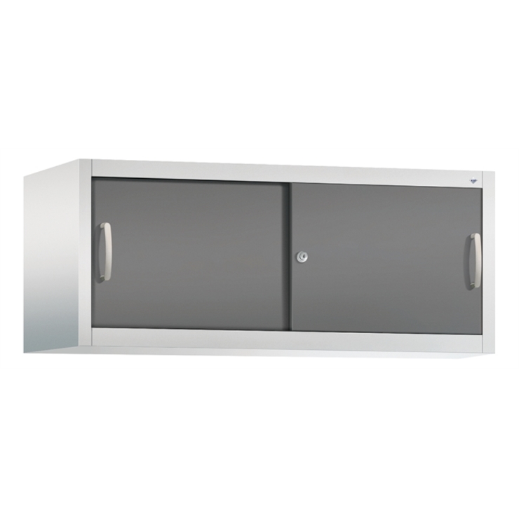 Stahl-Schiebetürenschrank Acurado-2000, als Aufsatzschrank, Korpus aus stabiler Stahlkonstruktion mit hochwertiger Einbrennbeschichtung für hohe UV-Beständigkeit, mit Kunststoffgleitern als praktischer Schrank- und Fußbodenschutz, hohe Flexibilität der Inneneinrichtung durch Höhenverstellbarkeit im 15 mm Raster, Türen verstärkt für hohe Stabilität, leichtgängige Bedienung durch Leichtlaufrollen in spezieller Schienenführung, 1 Wechselzylinder matt vernickelt mit 2 Schlüsseln, 2 Ergonomische Bügelgriffe Ergolock aus Metall für einfache Bedienung, matt vernickelt, Maße (H x B x T): 500 x 1200 x 500 mm, Korpus: RAL 7035 Lichtgrau, Türen: 0005000 RDS Vulkangrau