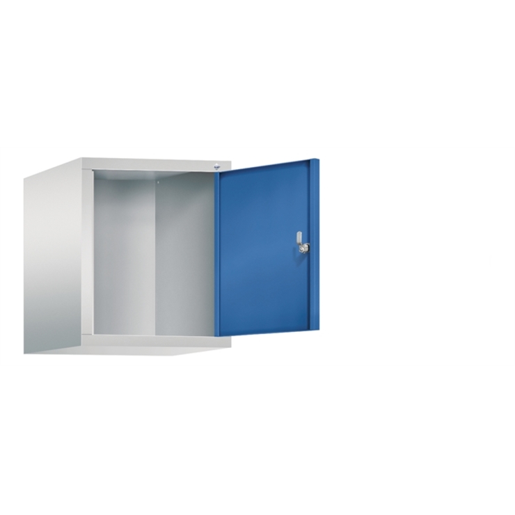 Stahl-Fächerschrank Classic, als Aufsatzschrank, 1 Abteil, Abteilbreite 400 mm, Türaufhängung oben und unten in Drehbolzen, rechts angeschlagen, 1 Drehriegel für Vorhangschloss, Maße (H x B x T): 500 x 420 x 500 mm, Korpus: RAL 7035 Lichtgrau, Türen Stahl: RAL 5010 Enzianblau