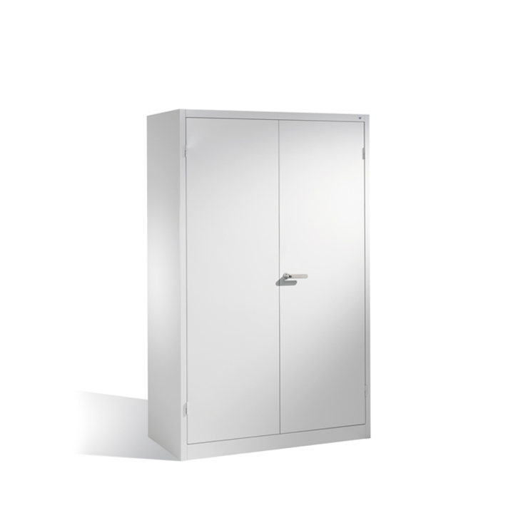 Stahl-Flügeltürenschrank Acurado-1000, Korpus aus stabiler Stahlkonstruktion mit hochwertiger Einbrennbeschichtung für hohe UV-Beständigkeit, mit Kunststoffgleitern als praktischer Schrank- und Fußbodenschutz, hohe Flexibilität der Inneneinrichtung durch Höhenverstellbarkeit im 15 mm Raster, Türen verstärkt für hohe Stabilität und verdeckten Schließstangen, Türaufhängung oben und unten in außen liegenden Scharnieren mit großzügigem Öffnungswinkel ca. 180 Grad, zueinanderschlagend für gemeinsamen Verschluss, 1 Wechselzylinder matt vernickelt mit 2 Schlüsseln, 1 Design- Klinkengriffschloss matt vernickelt (3-Riegelig) mit opionalem mit Wechselkernzylinder für noch bessere Optik und Bedienung, 4 Einlegeböden aus Stahl lackiert, mit hoher Traglast von 70 kg, Maße (H x B x T): 1950 x 1200 x 600 mm, Korpus: RAL 7035 Lichtgrau, Türen: RAL 7035 Lichtgrau, Inneneinrichtung: RAL 7035 Lichtgrau
