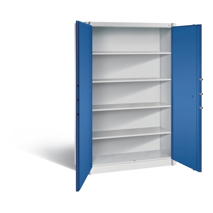 Feuergeschützter Stahl-Flügeltürenschrank Certos, Korpus und Türen aus stabiler Stahlkonstruktion mit hochwertiger Einbrennbeschichtung, allseitig doppelwandig und gedämmt mit 25 mm starken Spezial-Isolierplatten Klasse A1, nicht brennbar nach DIN 4102, Türaufhängung oben und unten in stabilen Drehbolzen, großzügiger Öffnungswinkel ca. 180 Grad, erhöhte Einbruchsicherheit durch stabile Türsicherungen, die links und rechts in die Seitenwände einrasten, Verriegelung über 5-fach Bolzenriegelwerk (seitlich 3x, oben/unten je 1x), 1 Doppelbart-Sicherheitsschloss mit 2 Schlüsseln, 1 robuster Schrankgriff, Farbe: Schwarz, 4 Einlegeböden aus Stahl lackiert, mit hoher Traglast von 70 kg, Maße (H x B x T): 1950 x 1200 x 500 mm, Korpus: RAL 7035 Lichtgrau, Türen: RAL 5010 Enzianblau, Inneneinrichtung: RAL 7035 Lichtgrau, sonstige Innenteile: RAL 7035 Lichtgrau