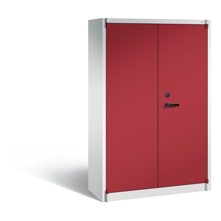 Feuergeschützter Stahl-Flügeltürenschrank Certos, Korpus und Türen aus stabiler Stahlkonstruktion mit hochwertiger Einbrennbeschichtung, allseitig doppelwandig und gedämmt mit 25 mm starken Spezial-Isolierplatten Klasse A1, nicht brennbar nach DIN 4102, Türaufhängung oben und unten in stabilen Drehbolzen, großzügiger Öffnungswinkel ca. 180 Grad, erhöhte Einbruchsicherheit durch stabile Türsicherungen, die links und rechts in die Seitenwände einrasten, Verriegelung über 5-fach Bolzenriegelwerk (seitlich 3x, oben/unten je 1x), 1 Doppelbart-Sicherheitsschloss mit 2 Schlüsseln, 1 robuster Schrankgriff, Farbe: Schwarz, 4 Einlegeböden aus Stahl lackiert, mit hoher Traglast von 70 kg, Maße (H x B x T): 1950 x 1200 x 500 mm, Korpus: RAL 7035 Lichtgrau, Türen: RAL 3003 Rubinrot, Inneneinrichtung: RAL 7035 Lichtgrau, sonstige Innenteile: RAL 7035 Lichtgrau
