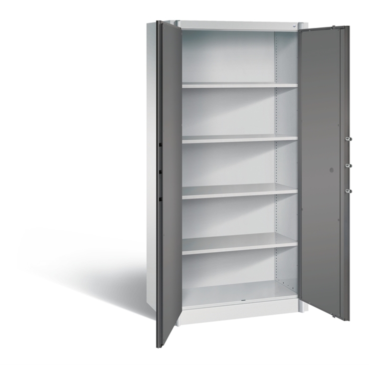 Feuergeschützter Stahl-Flügeltürenschrank Certos, Korpus und Türen aus stabiler Stahlkonstruktion mit hochwertiger Einbrennbeschichtung, allseitig doppelwandig und gedämmt mit 25 mm starken Spezial-Isolierplatten Klasse A1, nicht brennbar nach DIN 4102, Türaufhängung oben und unten in stabilen Drehbolzen, großzügiger Öffnungswinkel ca. 180 Grad, erhöhte Einbruchsicherheit durch stabile Türsicherungen, die links und rechts in die Seitenwände einrasten, Verriegelung über 5-fach Bolzenriegelwerk (seitlich 3x, oben/unten je 1x), 1 Doppelbart-Sicherheitsschloss mit 2 Schlüsseln, 1 robuster Schrankgriff, Farbe: Schwarz, 4 Einlegeböden aus Stahl lackiert, mit hoher Traglast von 70 kg, Maße (H x B x T): 1950 x 930 x 500 mm, Korpus: RAL 7035 Lichtgrau, Türen: 0005000 RDS Vulkangrau, Inneneinrichtung: RAL 7035 Lichtgrau, sonstige Innenteile: RAL 7035 Lichtgrau