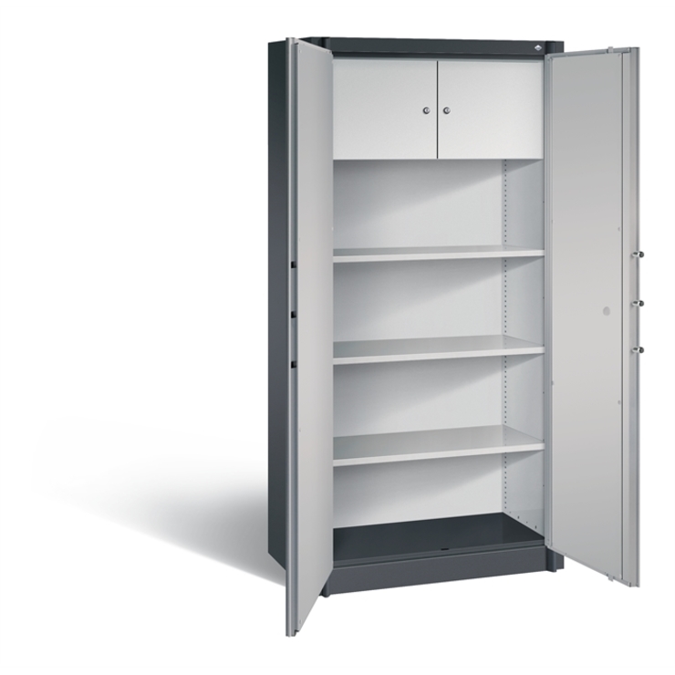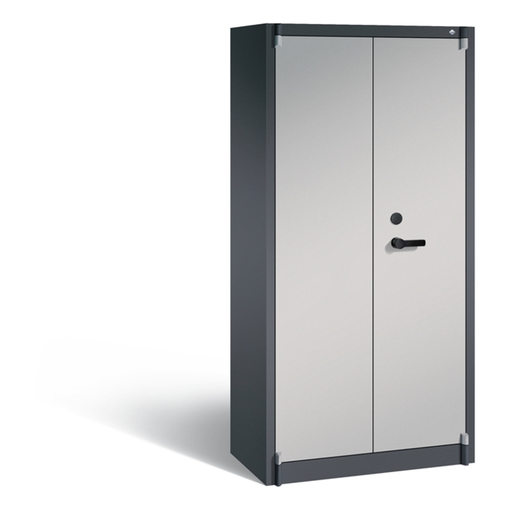 Feuergeschützter Stahl-Flügeltürenschrank Certos, Korpus und Türen aus stabiler Stahlkonstruktion mit hochwertiger Einbrennbeschichtung, allseitig doppelwandig und gedämmt mit 25 mm starken Spezial-Isolierplatten Klasse A1, nicht brennbar nach DIN 4102, Türaufhängung oben und unten in stabilen Drehbolzen, großzügiger Öffnungswinkel ca. 180 Grad, erhöhte Einbruchsicherheit durch stabile Türsicherungen, die links und rechts in die Seitenwände einrasten, Verriegelung über 5-fach Bolzenriegelwerk (seitlich 3x, oben/unten je 1x), 1 Doppelbart-Sicherheitsschloss mit 2 Schlüsseln, 1 robuster Schrankgriff, Farbe: Schwarz, 3 Einlegeböden aus Stahl lackiert, mit hoher Traglast von 70 kg, 1 oben Wertfach mit Flügeltüren und 2 einzeln abschließbaren Fächern mit Zylinderschloss, Maße (H x B x T): 1950 x 930 x 500 mm, Korpus: RAL 7021 Schwarzgrau, Türen: RAL 9006 Weißaluminium, Inneneinrichtung: RAL 7035 Lichtgrau, sonstige Innenteile: RAL 7035 Lichtgrau