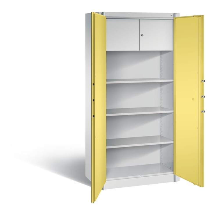 Feuergeschützter Stahl-Flügeltürenschrank Certos, Korpus und Türen aus stabiler Stahlkonstruktion mit hochwertiger Einbrennbeschichtung, allseitig doppelwandig und gedämmt mit 25 mm starken Spezial-Isolierplatten Klasse A1, nicht brennbar nach DIN 4102, Türaufhängung oben und unten in stabilen Drehbolzen, großzügiger Öffnungswinkel ca. 180 Grad, erhöhte Einbruchsicherheit durch stabile Türsicherungen, die links und rechts in die Seitenwände einrasten, Verriegelung über 5-fach Bolzenriegelwerk (seitlich 3x, oben/unten je 1x), 1 Doppelbart-Sicherheitsschloss mit 2 Schlüsseln, 1 robuster Schrankgriff, Farbe: Schwarz, 3 Einlegeböden aus Stahl lackiert, mit hoher Traglast von 70 kg, 1 oben großes Wertfach mit Flügeltüren, zueinanderschlagend für gemeinsamen Verschluss mit Zylinderschloss, Maße (H x B x T): 1950 x 930 x 500 mm, Korpus: RAL 7035 Lichtgrau, Türen: 0959059 RDS Schwefelgelb, Inneneinrichtung: RAL 7035 Lichtgrau, sonstige Innenteile: RAL 7035 Lichtgrau