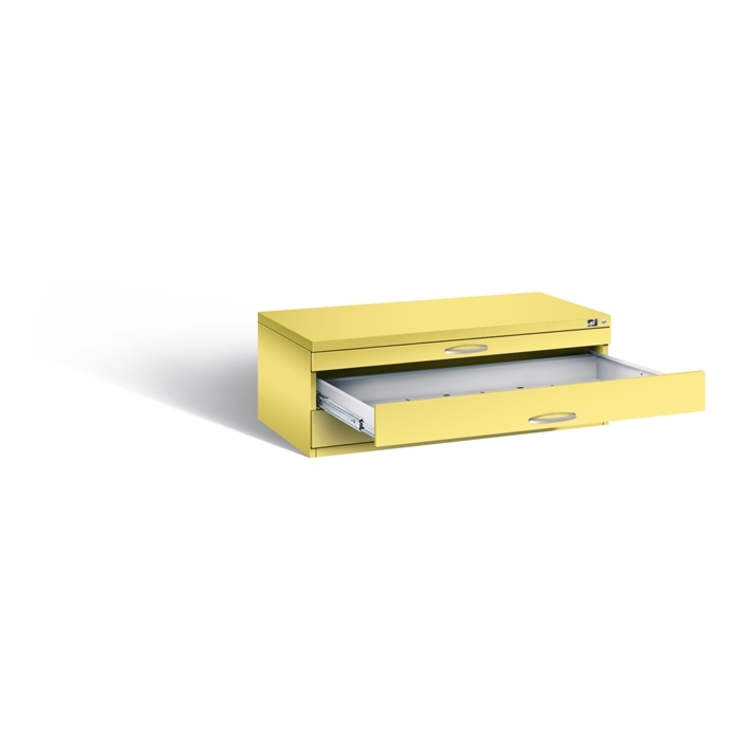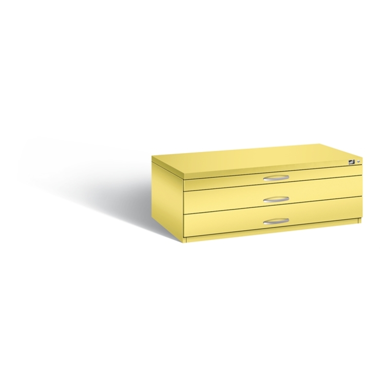Stahl-Schubladenschrank Serie 7100_7200, als Flachablageschrank, Korpus aus stabiler Stahlkonstruktion mit hochwertiger Einbrennbeschichtung für hohe UV-Beständigkeit, mit Kunststoffgleitern als praktischer Schrank- und Fußbodenschutz, 1 Zentralverschluss mit Druckzylinderschloss und 2 Schlüsseln, 3 Ergonomische Bügelgriffe Ergolock aus Metall für einfache Bedienung, matt vernickelt, 3 voll ausziehbare Schubladen, 45 mm hoch, gerastert und unterteilbar für Formate bis DIN A1, hinten mit Deckleiste und vorne mit schwenkbarem Niederhalter, auf langlebigen 2-fach Teleskopschienen mit hoher Traglast von 40 Kg, inkl. Auszugsperre und End-Selbst-Einzug, 1 Schubladenblenden doppelwandig, 66 mm hoch für lichte Schubladen-Nutzhöhe von 55 mm, 2 Schubladenblenden doppelwandig, 134 mm hoch für lichte Schubladen-Nutzhöhe von 120 mm, 3 hochwertige Etikettenrahmen aus Kunststoff, selbstklebend, inkl. weißem Beschriftungsschild, Maße (H x B x T): 420 x 1100 x 765 mm, Korpus: 0959059 RDS Schwefelgelb, Blenden: 0959059 RDS Schwefelgelb, Inneneinrichtung: RAL 7035 Lichtgrau
