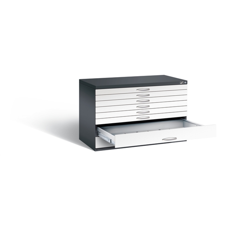 Stahl-Schubladenschrank Serie 7100_7200, als Flachablageschrank, Korpus aus stabiler Stahlkonstruktion mit hochwertiger Einbrennbeschichtung für hohe UV-Beständigkeit, mit Kunststoffgleitern als praktischer Schrank- und Fußbodenschutz, 1 Zentralverschluss mit Druckzylinderschloss und 2 Schlüsseln, 8 Ergonomische Bügelgriffe Ergolock aus Metall für einfache Bedienung, matt vernickelt, 8 voll ausziehbare Schubladen, 45 mm hoch, gerastert und unterteilbar für Formate bis DIN A1, hinten mit Deckleiste und vorne mit schwenkbarem Niederhalter, auf langlebigen 2-fach Teleskopschienen mit hoher Traglast von 40 Kg, inkl. Auszugsperre und End-Selbst-Einzug, 6 Schubladenblenden doppelwandig, 66 mm hoch für lichte Schubladen-Nutzhöhe von 55 mm, 2 Schubladenblenden doppelwandig, 134 mm hoch für lichte Schubladen-Nutzhöhe von 120 mm, 8 hochwertige Etikettenrahmen aus Kunststoff, selbstklebend, inkl. weißem Beschriftungsschild, Maße (H x B x T): 760 x 1100 x 765 mm, Korpus: RAL 7021 Schwarzgrau, Blenden: RAL 9016 Verkehrsweiß, Inneneinrichtung: RAL 7035 Lichtgrau