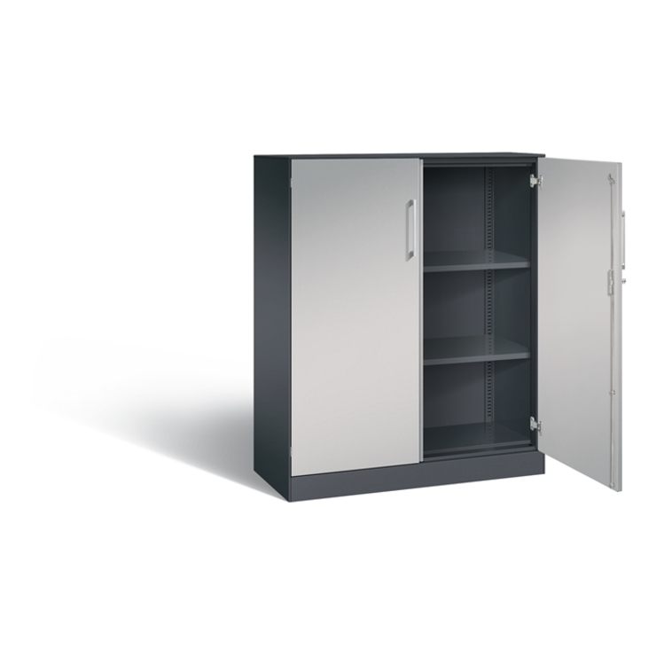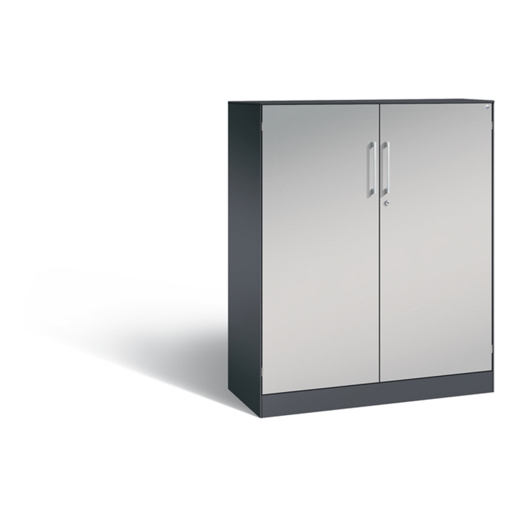 Stahl-Flügeltürenschrank Asisto, Korpus aus stabiler Stahlkonstruktion mit filigraner Kantenoptik und hochwertiger Einbrennbeschichtung für hohe UV-Beständigkeit, mit integrierter Niveauregulierung, bequem von innen bedienbar, hohe Flexibilität der Inneneinrichtung durch Höhenverstellbarkeit im 15 mm Raster, 1 Wechselzylinder matt vernickelt mit 2 Schlüsseln, 2 Ergonomische Design-Bügelgriffe für einfache Bedienung, aus Metall, matt vernickelt, 1 Abdeckplatte aus Stahl, 2 Stahltüren doppelwandig, gedämmt für angenehmes Geräuschverhalten, Türaufhängung in innen liegenden Scharnieren mit großzügigem Öffnungswinkel ca. 225 Grad, zueinanderschlagend für gemeinsamen Verschluss, 2 Einlegeböden aus Stahl lackiert, mit hoher Traglast von 70 kg, Maße (H x B x T): 1310 x 1000 x 435 mm, Korpus: RAL 7021 Schwarzgrau, Türen: RAL 9006 Weißaluminium, Inneneinrichtung: RAL 7021 Schwarzgrau