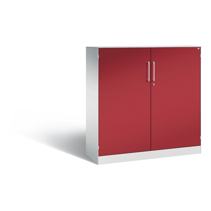 Stahl-Flügeltürenschrank Asisto, Korpus aus stabiler Stahlkonstruktion mit filigraner Kantenoptik und hochwertiger Einbrennbeschichtung für hohe UV-Beständigkeit, mit integrierter Niveauregulierung, bequem von innen bedienbar, hohe Flexibilität der Inneneinrichtung durch Höhenverstellbarkeit im 15 mm Raster, 1 Wechselzylinder matt vernickelt mit 2 Schlüsseln, 2 Ergonomische Design-Bügelgriffe für einfache Bedienung, aus Metall, matt vernickelt, 1 Abdeckplatte aus Stahl, 2 Stahltüren doppelwandig, gedämmt für angenehmes Geräuschverhalten, Türaufhängung in innen liegenden Scharnieren mit großzügigem Öffnungswinkel ca. 225 Grad, zueinanderschlagend für gemeinsamen Verschluss, 2 Einlegeböden aus Stahl lackiert, mit hoher Traglast von 70 kg, Maße (H x B x T): 1310 x 1200 x 435 mm, Korpus: RAL 7035 Lichtgrau, Türen: RAL 3003 Rubinrot, Inneneinrichtung: RAL 7021 Schwarzgrau