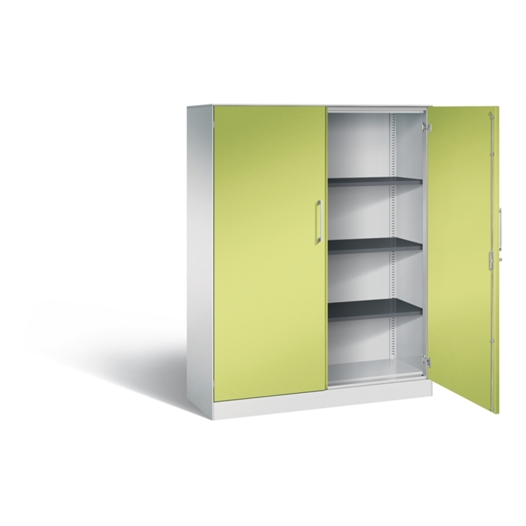 Stahl-Flügeltürenschrank Asisto, Korpus aus stabiler Stahlkonstruktion mit filigraner Kantenoptik und hochwertiger Einbrennbeschichtung für hohe UV-Beständigkeit, mit integrierter Niveauregulierung, bequem von innen bedienbar, hohe Flexibilität der Inneneinrichtung durch Höhenverstellbarkeit im 15 mm Raster, 1 Wechselzylinder matt vernickelt mit 2 Schlüsseln, 2 Ergonomische Design-Bügelgriffe für einfache Bedienung, aus Metall, matt vernickelt, 1 Abdeckplatte aus Stahl, 2 Glastüren aus Einscheiben-Sicherheitsglas (ESG), Türaufhängung in innen liegenden Scharnieren mit großzügigem Öffnungswinkel ca. 225 Grad, zueinanderschlagend für gemeinsamen Verschluss, 3 Einlegeböden aus Stahl lackiert, mit hoher Traglast von 70 kg, Maße (H x B x T): 1635 x 1200 x 435 mm, Korpus: RAL 7035 Lichtgrau, Türen: 1108060 RDS Viridingrün, Inneneinrichtung: RAL 7021 Schwarzgrau