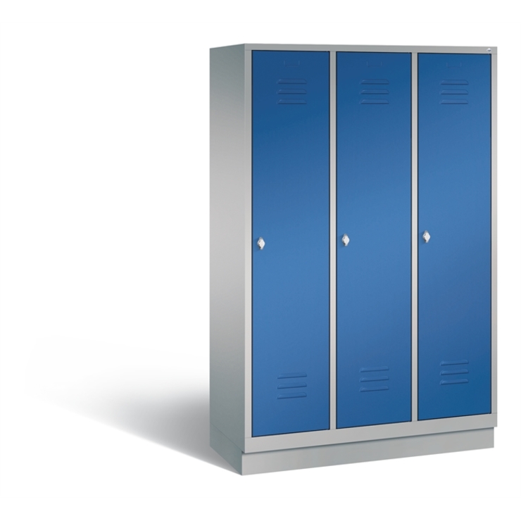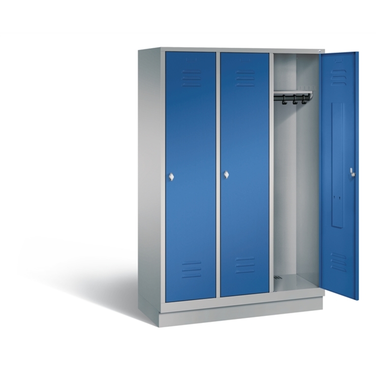 Stahl-Garderobenschrank Classic, 3 Abteile, Abteilbreite 400 mm, Korpus aus stabiler Stahlkonstruktion mit hochwertiger Einbrennbeschichtung für hohe UV- und Korrosionsbeständigkeit, innen je Abteil 1 Ablageboden, darunter 1 stabile Garderobenstange aus Ovalprofil mit 3 verdrehsicheren Schiebehaken, Schrankboden hinten mit Lüftungsöffnungen für optimale Luftzirkulation, auf 100 mm hohem Sockel, mit Kunststoffgleitern als praktischer Schrank- und Fußbodenschutz, vorne zurückgesetzt und oberhalb mit Luftdurchlass, 3 Drehriegel für Vorhängeschlösser, Türen mit Anschlagsdämpfer und mittiger Verstärkung für hohe Stabilität, mit Lüftungschlitzen oben und unten sowie eingestanztem Etikettenrahmen, Türaufhängung in Drehbolzen, Maße (H x B x T): 1800 x 1200 x 500 mm, Korpus: RAL 9006 Weißaluminium, Türen Stahl: RAL 5010 Enzianblau, Inneneinrichtung: RAL 9006 Weißaluminium