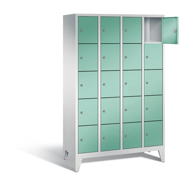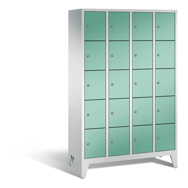Stahl-Garderobenschrank Classic, 4 Abteile mit 5 Fächern, Abteilbreite 300 mm, Korpus aus stabiler Stahlkonstruktion mit hochwertiger Einbrennbeschichtung für hohe UV- und Korrosionsbeständigkeit, auf 150 mm hohen Füßen aus Kunststoff für erweiterten Korrosionsschutz, 20 Zylinderschlösser mit je 2 Schlüsseln, Schließkreis bis 1000 verschiedene Schließungen, Türen mit Anschlagsdämpfer, Türaufhängung in Drehbolzen, Maße (H x B x T): 1850 x 1190 x 500 mm, Korpus: RAL 7035 Lichtgrau, Türen Stahl: RAL 6027 Lichtgrün, Füße: RAL 7035 Lichtgrau
