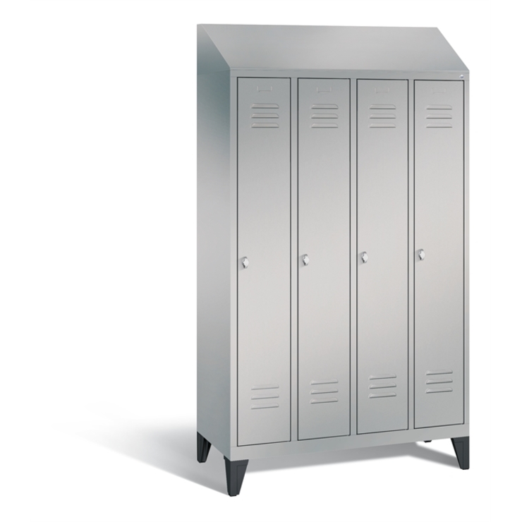 Stahl-Garderobenschrank Classic, 4 Abteile, Abteilbreite 300 mm, Korpus aus stabiler Stahlkonstruktion mit hochwertiger Einbrennbeschichtung für hohe UV- und Korrosionsbeständigkeit, innen je Abteil 1 Ablageboden, darunter 1 stabile Garderobenstange aus Ovalprofil mit 3 verdrehsicheren Schiebehaken, Schrankboden hinten mit Lüftungsöffnungen für optimale Luftzirkulation, auf 150 mm hohen Füßen aus Kunststoff für erweiterten Korrosionsschutz, 4 Drehriegel für Vorhängeschlösser, Türen mit Anschlagsdämpfer und mittiger Verstärkung für hohe Stabilität, mit Lüftungschlitzen oben und unten sowie eingestanztem Etikettenrahmen, Türaufhängung in Drehbolzen, Schrägdachaufsatz mit 26 Grad Neigung, verhindert das Liegenbleiben von Gegenständen, Maße (H x B x T): 1850 x 1190 x 500 mm, Korpus: RAL 9006 Weißaluminium, Türen Stahl: RAL 9006 Weißaluminium, Inneneinrichtung: RAL 9006 Weißaluminium, Füße: RAL 9005 Tiefschwarz, Schrägdach: RAL 9006 Weißaluminium