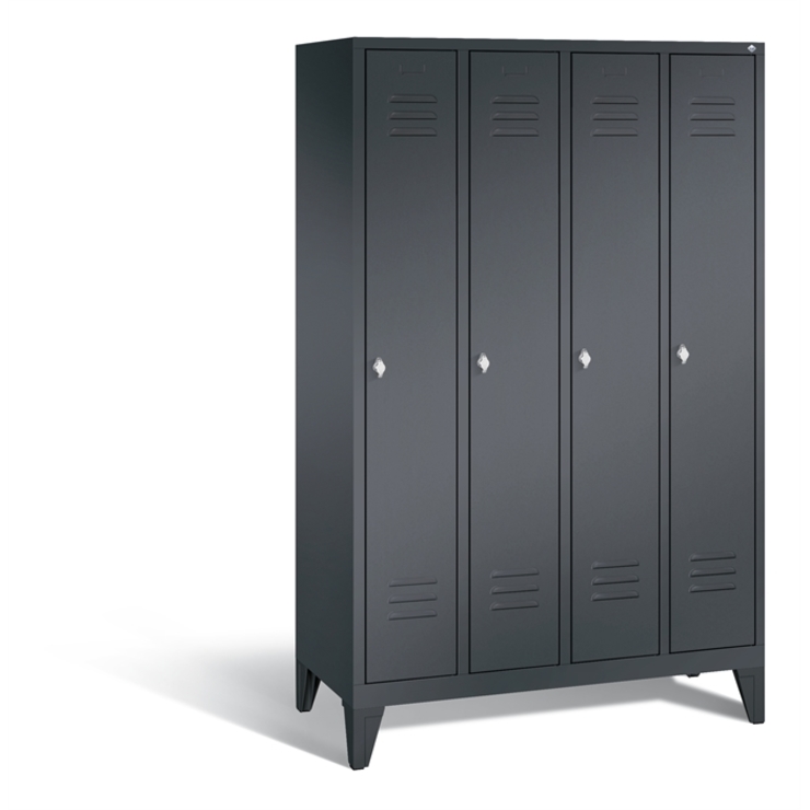 Stahl-Garderobenschrank Classic, 4 Abteile, Abteilbreite 300 mm, Korpus aus stabiler Stahlkonstruktion mit hochwertiger Einbrennbeschichtung für hohe UV- und Korrosionsbeständigkeit, innen je Abteil 1 Ablageboden, darunter 1 stabile Garderobenstange aus Ovalprofil mit 3 verdrehsicheren Schiebehaken, Schrankboden hinten mit Lüftungsöffnungen für optimale Luftzirkulation, auf 150 mm hohen Füßen aus Kunststoff für erweiterten Korrosionsschutz, 4 Drehriegel für Vorhängeschlösser, Türen mit Anschlagsdämpfer und mittiger Verstärkung für hohe Stabilität, mit Lüftungschlitzen oben und unten sowie eingestanztem Etikettenrahmen, Türaufhängung in Drehbolzen, Maße (H x B x T): 1850 x 1190 x 500 mm, Korpus: RAL 7021 Schwarzgrau, Türen Stahl: RAL 7021 Schwarzgrau, Inneneinrichtung: RAL 7021 Schwarzgrau, Füße: RAL 9005 Tiefschwarz