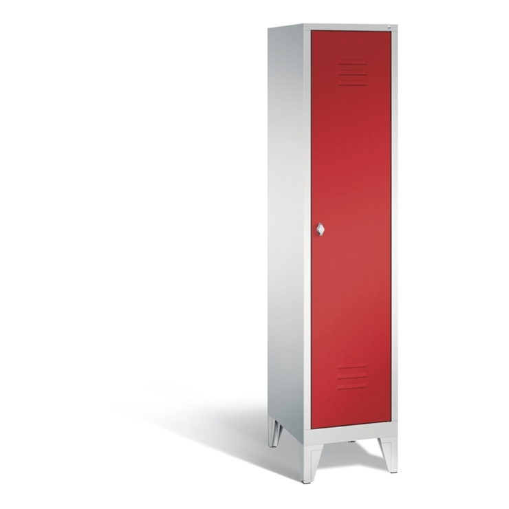 Stahl-Garderobenschrank Classic, 1 Abteil, Abteilbreite 400 mm, Korpus aus stabiler Stahlkonstruktion mit hochwertiger Einbrennbeschichtung für hohe UV- und Korrosionsbeständigkeit, innen je Abteil 1 Ablageboden, darunter 1 stabile Garderobenstange aus Ovalprofil mit 3 verdrehsicheren Schiebehaken, Schrankboden hinten mit Lüftungsöffnungen für optimale Luftzirkulation, auf 150 mm hohen Füßen aus Kunststoff für erweiterten Korrosionsschutz, 1 Drehriegel für Vorhangschloss, Tür mit Anschlagsdämpfer und mittiger Verstärkung für hohe Stabilität, mit Lüftungschlitzen oben und unten sowie eingestanztem Etikettenrahmen, Türaufhängung in Drehbolzen, Maße (H x B x T): 1850 x 420 x 500 mm, Korpus: RAL 7035 Lichtgrau, Türen Stahl: RAL 3000 feuerrot, Inneneinrichtung: RAL 7035 Lichtgrau, Füße: RAL 7035 Lichtgrau