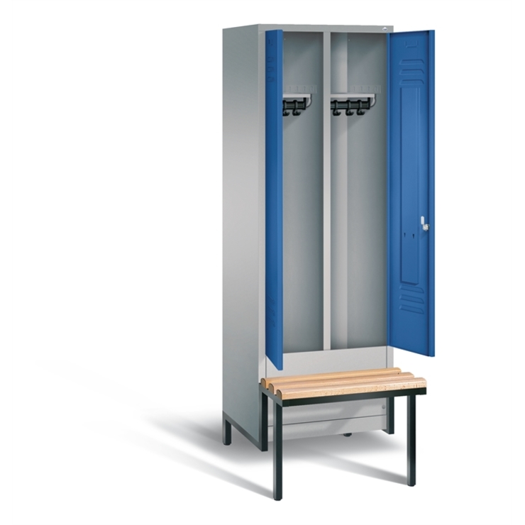 Stahl-Garderobenschrank Classic, auf untergebauter Sitzbank, Gestell aus stabilem Vierkant-Stahlrohr 30 x 30 mm, mit verstellbaren Bodengleitern für einfachen Niveauausgleich, 2 Abteile, Abteilbreite 400 mm, z-förmig unterteilt für 4 Personen, Korpus aus stabiler Stahlkonstruktion mit hochwertiger Einbrennbeschichtung für hohe UV- und Korrosionsbeständigkeit, innen komfortable Hängemöglichkeit langer Kleidungsstücke trotz geringem Platzangebot, je Fach 1 stabile Garderobenstange aus... (mehr)? Papersmart hilft Ihnen, den besten Anbieter für Ihren gesamten Warenkorb zu ermitteln.