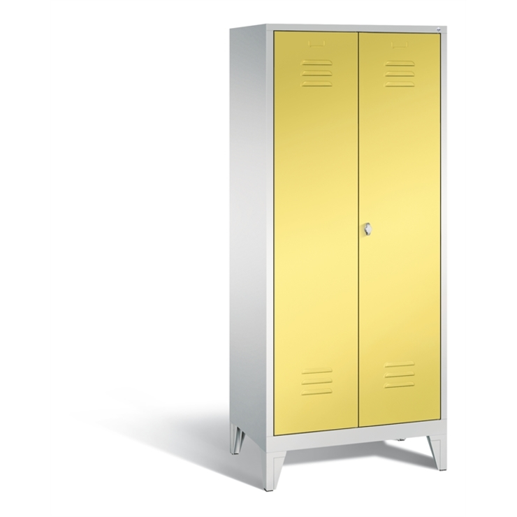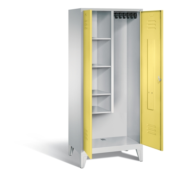 Stahl-Garderobenschrank Classic, mit verkürzter Mitteltrennwand, Abteilbreite 400 mm, Türen zueinanderschlagend für gemeinsamen Verschluss, Korpus aus stabiler Stahlkonstruktion mit hochwertiger Einbrennbeschichtung für hohe UV- und Korrosionsbeständigkeit, links 4 fest eingebaute Einlegeböden, stabile Garderobenstange aus Ovalprofil mit 6 verdrehsicheren Schiebehaken, auf 150 mm hohen Füßen aus Kunststoff für optimalen Korrosionsschutz, 1 Drehriegel für Vorhangschloss, Türen mit Anschlagsdämpfer und mittiger Verstärkung für hohe Stabilität, mit Lüftungschlitzen oben und unten sowie eingestanztem Etikettenrahmen, Türaufhängung in Drehbolzen, Maße (H x B x T): 1850 x 810 x 500 mm, Korpus: RAL 7035 Lichtgrau, Türen Stahl: 0959059 RDS Schwefelgelb, Füße: RAL 7035 Lichtgrau