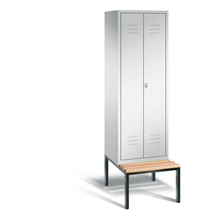 Stahl-Garderobenschrank Classic, 2 Abteile für 1 Person, Abteilbreite 300 mm, Türen zueinanderschlagend für gemeinsamen Verschluss, Korpus aus stabiler Stahlkonstruktion mit hochwertiger Einbrennbeschichtung für hohe UV- und Korrosionsbeständigkeit, innen je Abteil 1 Ablageboden, darunter 1 stabile Garderobenstange aus Ovalprofil mit 3 verdrehsicheren Schiebehaken, Schrankboden hinten mit Lüftungsöffnungen für optimale Luftzirkulation, auf untergebauter Sitzbank, Gestell aus stabilem Vierkant-Stahlrohr 30 x 30 mm, mit verstellbaren Bodengleitern für einfachen Niveauausgleich, 1 Drehriegel für Vorhangschloss, Türen mit Anschlagsdämpfer und mittiger Verstärkung für hohe Stabilität, mit Lüftungschlitzen oben und unten sowie eingestanztem Etikettenrahmen, Türaufhängung in Drehbolzen, 1 Sitzleisten aus Buche-Hartholz, im Profil ca. 60 x 30 mm, allseitig gehobelt, oben abgerundet für guten Sitzkomfort, klarlackiert mit naturgegebenen Farbunterschieden, 1 Maße (H x B x T): 2090 x 610 x 815 mm, Korpus: RAL 7035 Lichtgrau, Türen Stahl: RAL 7035 Lichtgrau, Inneneinrichtung: RAL 7035 Lichtgrau, Gestell: RAL 7021 Schwarzgrau