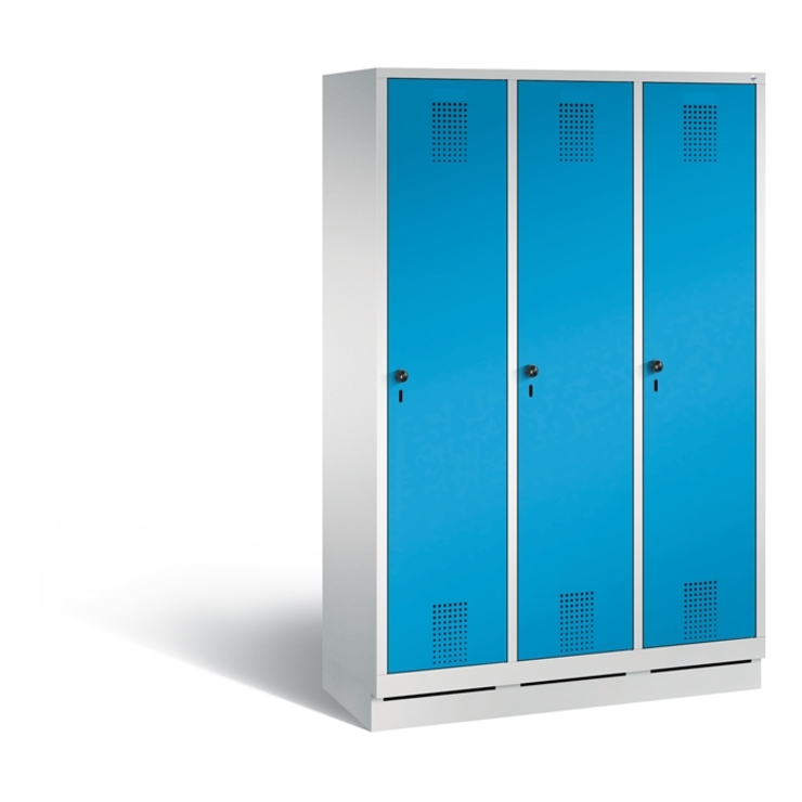 Stahl-Garderobenschrank Evolo, 3 Abteile, Abteilbreite 300 mm, Korpus aus stabiler Stahlkonstruktion mit hochwertiger Einbrennbeschichtung für hohe UV- und Korrosionsbeständigkeit, innen je Abteil 1 Ablageboden, darunter 1 stabile Garderobenstange aus Ovalprofil mit 3 verdrehsicheren Schiebehaken, Schrankboden hinten mit großflächigem Luftdurchlass für optimale Luftzirkulation, auf 100 mm hohem Sockel, mit Kunststoffgleitern als praktischer Schrank- und Fußbodenschutz, vorne... (mehr)? Papersmart hilft Ihnen, den besten Anbieter für Ihren gesamten Warenkorb zu ermitteln.