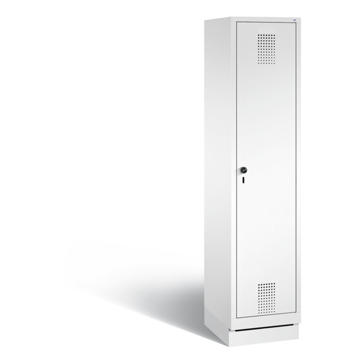 Stahl-Garderobenschrank Evolo, 1 Abteil, Abteilbreite 400 mm, Korpus aus stabiler Stahlkonstruktion mit hochwertiger Einbrennbeschichtung für hohe UV- und Korrosionsbeständigkeit, innen je Abteil 1 Ablageboden, darunter 1 stabile Garderobenstange aus Ovalprofil mit 3 verdrehsicheren Schiebehaken, Schrankboden hinten mit großflächigem Luftdurchlass für optimale Luftzirkulation, auf 100 mm hohem Sockel, mit Kunststoffgleitern als praktischer Schrank- und Fußbodenschutz, vorne zurückgesetzt und oberhalb mit Luftdurchlass, 1 Ergonomischer Sicherheits-Drehriegel für Vorhangschloss inkl. Tür- Schutz, Tür mit Anschlagsdämpfer und geschlossenen Seitenprofilen für höchste Stabilität und Einbruchsicherheit, mit reinigungsfreundlichem Belüftungslochbild oben und unten sowie eingeprägtem Etikettenrahmen, Türaufhängung in Drehbolzen, Maße (H x B x T): 1800 x 420 x 500 mm, Korpus: RAL 9016 Verkehrsweiß, Türen Stahl: RAL 9016 Verkehrsweiß, Inneneinrichtung: RAL 7021 Schwarzgrau