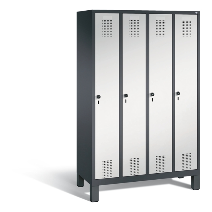 Stahl-Garderobenschrank Evolo, 4 Abteile, Abteilbreite 300 mm, Korpus aus stabiler Stahlkonstruktion mit hochwertiger Einbrennbeschichtung für hohe UV- und Korrosionsbeständigkeit, innen je Abteil 1 Ablageboden, darunter 1 stabile Garderobenstange aus Ovalprofil mit 3 verdrehsicheren Schiebehaken, Schrankboden hinten mit großflächigem Luftdurchlass für optimale Luftzirkulation, auf 150 mm hohen Füßen aus Kunststoff für erweiterten Korrosionsschutz, mit integrierter Niveauregulierung... (mehr)? Papersmart hilft Ihnen, den besten Anbieter für Ihren gesamten Warenkorb zu ermitteln.