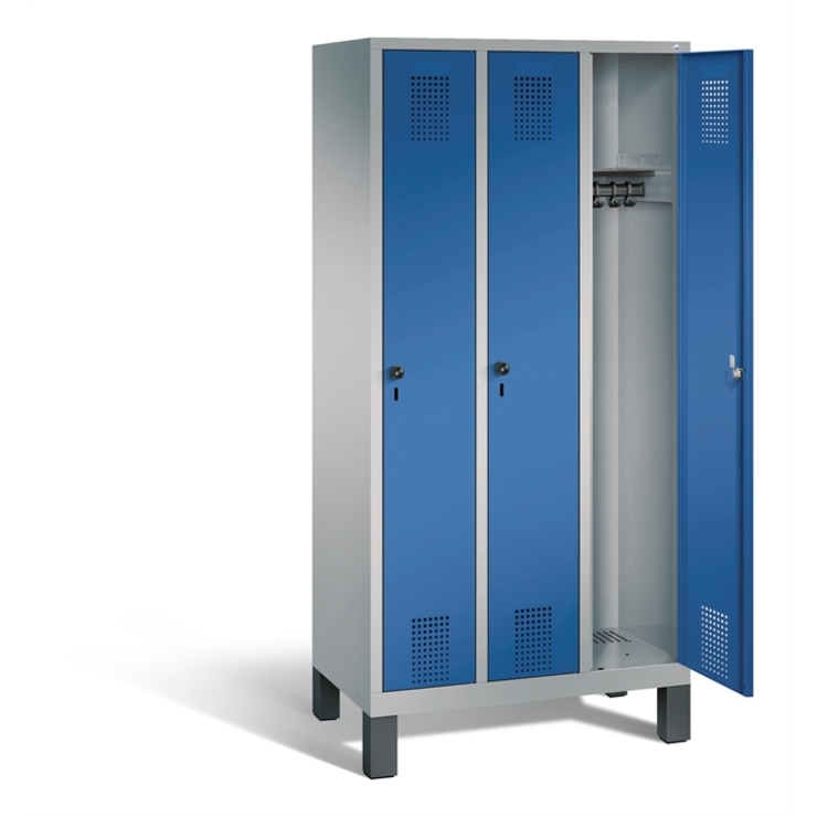 Stahl-Garderobenschrank Evolo, als Straßen- und Berufskleidungsschrank, 2 Abteile für 1 Person, Abteilbreite 300 mm, 1 Tür über 2 Abteile, rechts angeschlagen, Korpus aus stabiler Stahlkonstruktion mit hochwertiger Einbrennbeschichtung für hohe UV- und Korrosionsbeständigkeit, innen je Abteil 1 Ablageboden, darunter 1 stabile Garderobenstange aus Ovalprofil mit 3 verdrehsicheren Schiebehaken, Schrankboden hinten mit großflächigem Luftdurchlass, auf untergebauter Sitzbank, Gestell aus... (mehr)? Papersmart hilft Ihnen, den besten Anbieter für Ihren gesamten Warenkorb zu ermitteln.