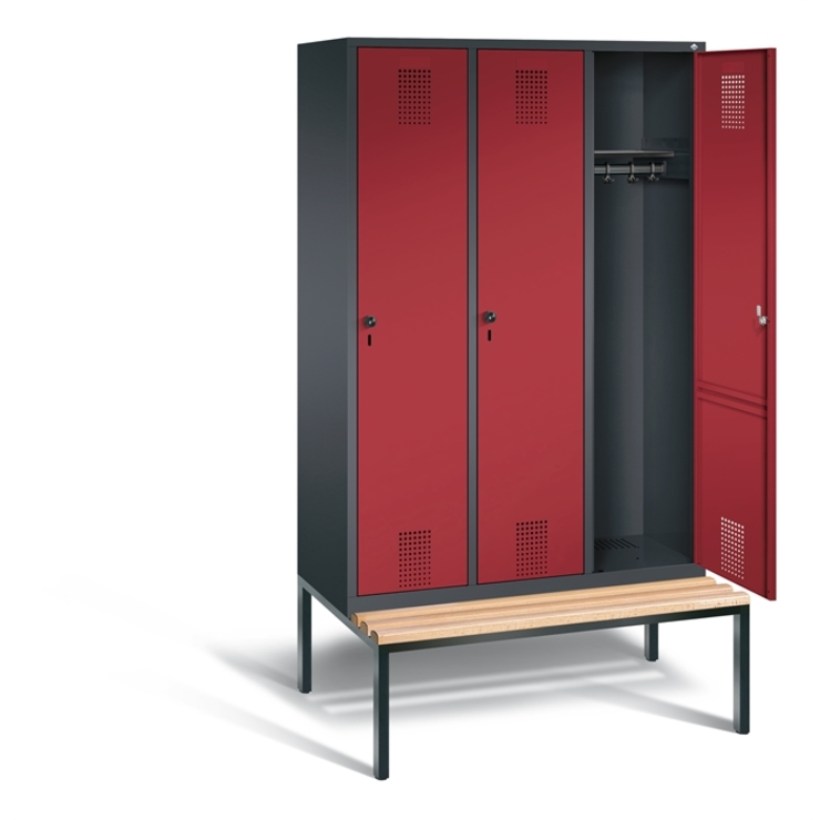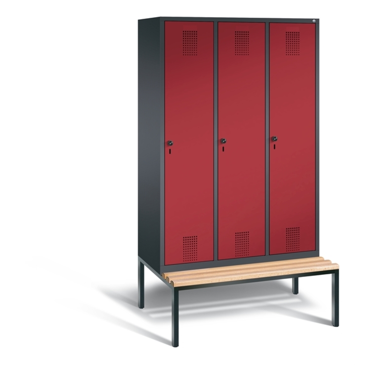 Stahl-Garderobenschrank Evolo, 3 Abteile, Abteilbreite 400 mm, Korpus aus stabiler Stahlkonstruktion mit hochwertiger Einbrennbeschichtung für hohe UV- und Korrosionsbeständigkeit, innen je Abteil 1 Ablageboden, darunter 1 stabile Garderobenstange aus Ovalprofil mit 3 verdrehsicheren Schiebehaken, Schrankboden hinten mit großflächigem Luftdurchlass für optimale Luftzirkulation, auf untergebauter Sitzbank, Gestell aus stabilem Vierkant-Stahlrohr 30 x 30 mm, mit verstellbaren Bodengleitern für einfachen Niveauausgleich, 3 Ergonomische Sicherheits-Drehriegel für Vorhängeschlösser inkl. Tür-Schutz, Türen mit Anschlagsdämpfer und geschlossenen Seitenprofilen für höchste Stabilität und Einbruchsicherheit, mit reinigungsfreundlichem Belüftungslochbild oben und unten sowie eingeprägtem Etikettenrahmen, Türaufhängung in Drehbolzen, 1 Entfall der Füße 1 Sitzleisten aus Buche-Hartholz, im Profil ca. 60 x 30 mm, allseitig gehobelt, oben abgerundet für guten Sitzkomfort, klarlackiert mit naturgegebenen Farbunterschieden, 1 Maße (H x B x T): 2090 x 1200 x 815 mm, Korpus: RAL 7021 Schwarzgrau, Türen Stahl: RAL 3003 Rubinrot, Inneneinrichtung: RAL 7021 Schwarzgrau, Gestell: RAL 7021 Schwarzgrau