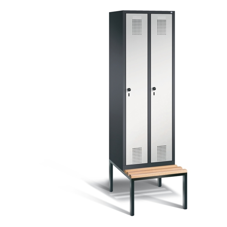 Stahl-Garderobenschrank Evolo, als Straßen- und Berufskleidungsschrank, 2 Abteile für 1 Person, Abteilbreite 300 mm, Türen zueinanderschlagend für gemeinsamen Verschluss, Korpus aus stabiler Stahlkonstruktion mit hochwertiger Einbrennbeschichtung für hohe UV- und Korrosionsbeständigkeit, innen 1 durchgehender Ablageboden, darunter je Abteil 1 stabile Garderobenstange aus Ovalprofil mit 3 verdrehsicheren Schiebehaken, Schrankboden hinten mit großflächigem Luftdurchlass für optimale... (mehr)? Papersmart hilft Ihnen, den besten Anbieter für Ihren gesamten Warenkorb zu ermitteln.