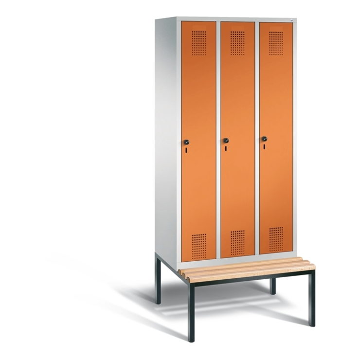 Stahl-Garderobenschrank Evolo, 3 Abteile, Abteilbreite 300 mm, Korpus aus stabiler Stahlkonstruktion mit hochwertiger Einbrennbeschichtung für hohe UV- und Korrosionsbeständigkeit, innen je Abteil 1 Ablageboden, darunter 1 stabile Garderobenstange aus Ovalprofil mit 3 verdrehsicheren Schiebehaken, Schrankboden hinten mit großflächigem Luftdurchlass für optimale Luftzirkulation, auf untergebauter Sitzbank, Gestell aus stabilem Vierkant-Stahlrohr 30 x 30 mm, mit verstellbaren Bodengleitern für einfachen Niveauausgleich, 3 Ergonomische Sicherheits-Drehriegel für Vorhängeschlösser inkl. Tür-Schutz, Türen mit Anschlagsdämpfer und geschlossenen Seitenprofilen für höchste Stabilität und Einbruchsicherheit, mit reinigungsfreundlichem Belüftungslochbild oben und unten sowie eingeprägtem Etikettenrahmen, Türaufhängung in Drehbolzen, 1 Entfall der Füße 1 Sitzleisten aus Buche-Hartholz, im Profil ca. 60 x 30 mm, allseitig gehobelt, oben abgerundet für guten Sitzkomfort, klarlackiert mit naturgegebenen Farbunterschieden, 1 Maße (H x B x T): 2090 x 900 x 815 mm, Korpus: RAL 7035 Lichtgrau, Türen Stahl: RAL 2000 Gelborange, Inneneinrichtung: RAL 7021 Schwarzgrau, Gestell: RAL 7021 Schwarzgrau