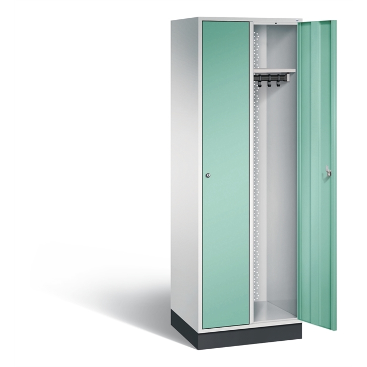 Stahl-Garderobenschrank Intro, 2 Abteile, Abteilbreite 300 mm, Korpus aus stabiler Stahlkonstruktion mit hochwertiger Einbrennbeschichtung für hohe UV- und Korrosionsbeständigkeit, Türen verstärkt für hohe Stabilität mit Anschlagsdämpfer, Türaufhängung durchgängig mit robustem Scharnierband, rechts angeschlagen, innen je Abteil 1 Ablageboden und 1 stabile Garderobenstange aus Ovalprofil mit 3 verdrehsicheren Schiebehaken, mit Belüftungslochbild in der Rückwand und 18 mm Wandabstandshaltern, auf 100 mm hohem Sockel, 2 Zylinderschlösser mit je 2 Schlüsseln, Schließkreis bis 1000 verschiedene Schließungen, Maße (H x B x T): 1950 x 620 x 490 mm, Korpus: RAL 7035 Lichtgrau, Türen: RAL 6027 Lichtgrün, Sockel: RAL 7021 Schwarzgrau