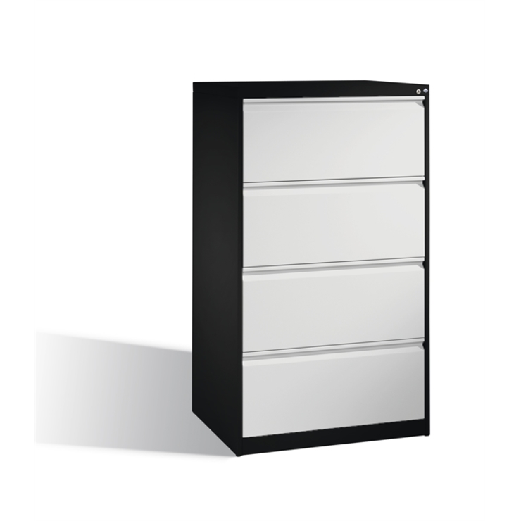 Stahl-Schubladenschrank Acurado, als Hängeregistraturschrank, Korpus aus stabiler Stahlkonstruktion mit hochwertiger Einbrennbeschichtung für hohe UV-Beständigkeit, 4 voll ausziehbare Schubladen mit integrierter durchgehender Griffleiste, 2- bahnig, für Hängehefter DIN A4, Schubladenwannen lackiert, auf langlebigen 2-fach Teleskopschienen mit hoher Traglast von 50 Kg je Schub, inkl. Auszugsperre, Zentralverschluss, 1 Wechselzylinder matt vernickelt mit 2 Schlüsseln, 4 hochwertige Etikettenrahmen aus Kunststoff, selbstklebend, inkl. weißem Beschriftungsschild, Maße (H x B x T): 1357 x 787 x 590 mm, Korpus: RAL 7021 Schwarzgrau, Blenden: RAL 7035 Lichtgrau, Inneneinrichtung: RAL 7035 Lichtgrau