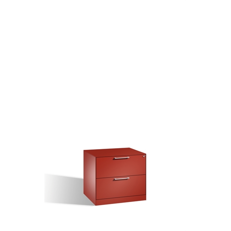 Stahl-Schubladenschrank Asisto, als Hängeregistraturschrank, Korpus aus stabiler Stahlkonstruktion, körperschallgedämpft für angenehmes Geräuschverhalten, mit filigraner Kantenoptik und hochwertiger Einbrennbeschichtung für hohe UV- Beständigkeit, mit integrierter Niveauregulierung von innen bedienbar, 2 voll ausziehbare Schubladen, 2-bahnig, für Hängehefter DIN A4 quer, 1 Wechselzylinder matt vernickelt mit 2 Schlüsseln, 2 Ergonomische Design-Bügelgriffe für einfache Bedienung, aus Metall, matt vernickelt, 2 selbstklebende Kunststoff-Etikettenrahmen, zur Ergänzung der beiliegenden Beschriftungsschilder, inkl. Etikett und Klarsicht-Abdeckung, 1 Schubladenblenden aus Stahl, 1 Schubladenblenden aus Stahl, 1 filigrane Stahl-Abdeckplatte, schallgedämmt Maße (H x B x T): 710 x 800 x 600 mm, Korpus: RAL 3000 feuerrot, Blenden: RAL 3000 feuerrot, Inneneinrichtung: RAL 7021 Schwarzgrau