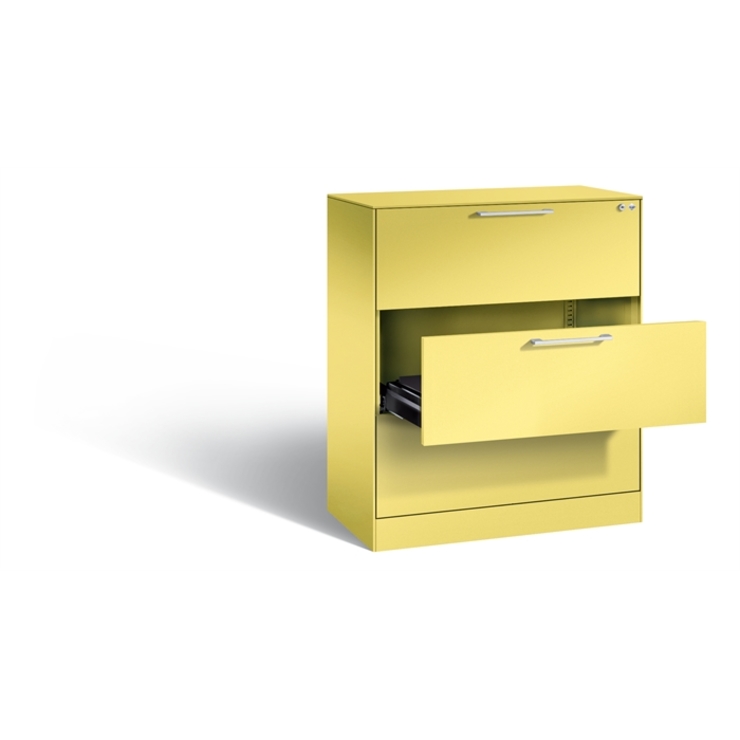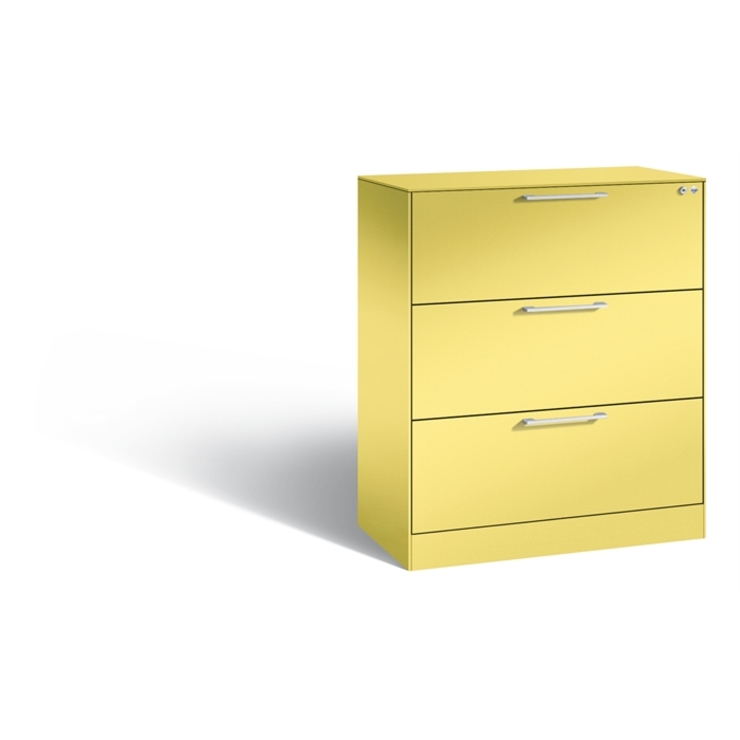 Stahl-Schubladenschrank Asisto, als Karteischrank, Korpus aus stabiler Stahlkonstruktion, körperschallgedämpft für angenehmes Geräuschverhalten, mit filigraner Kantenoptik und hochwertiger Einbrennbeschichtung für hohe UV- Beständigkeit, mit integrierter Niveauregulierung von innen bedienbar, 3 voll ausziehbare Schubladen, 2-bahnig, für Karteikarten DIN A4 quer, mit 2 verstellbaren Pendelblechen je Bahn, auf langlebigen Teleskopschienen mit Parallelsteuerung, End-Selbst-Einzug und Auszugsperre, hohe Traglast 50 Kg je Schublade, 1 Wechselzylinder matt vernickelt mit 2 Schlüsseln, 3 Ergonomische Design-Bügelgriffe für einfache Bedienung, aus Metall, matt vernickelt, 1 selbstklebender Kunststoff-Etikettenrahmen, zur Ergänzung der beiliegenden Beschriftungsschilder, inkl. Etikett und Klarsicht-Abdeckung, Set bestehend aus 3 Stück, 1 Schubladenblenden aus Stahl, 2 Schubladenblenden aus Stahl, 1 Abdeckplatte aus Stahl, Maße (H x B x T): 1010 x 800 x 435 mm, Korpus: 0959059 RDS Schwefelgelb, Blenden: 0959059 RDS Schwefelgelb, Inneneinrichtung: RAL 7021 Schwarzgrau