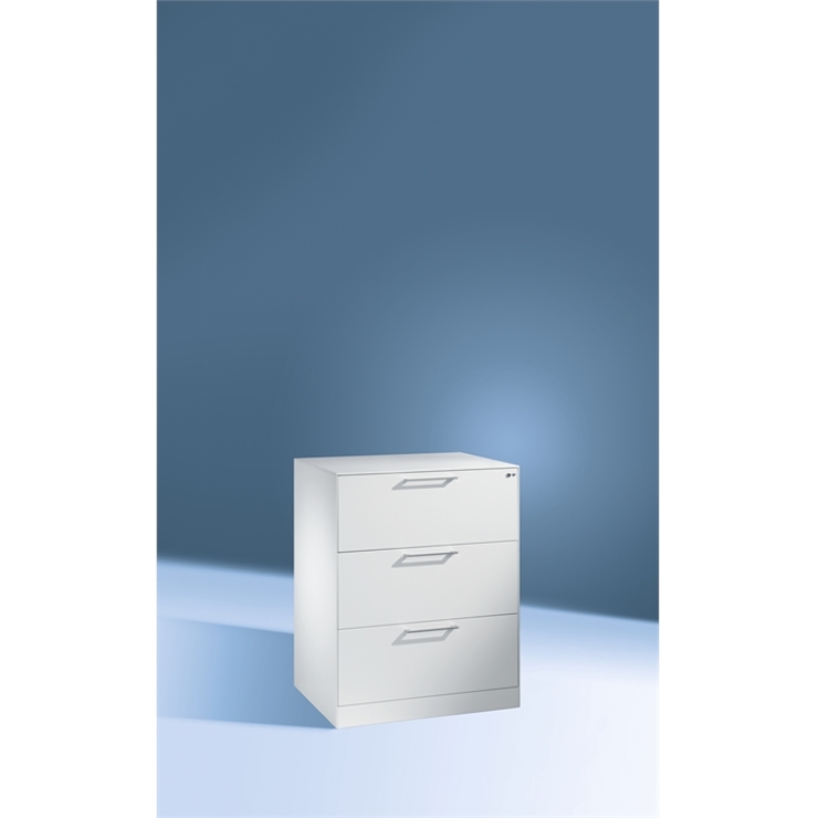 Stahl-Schubladenschrank Asisto, als Karteischrank, Korpus aus stabiler Stahlkonstruktion, körperschallgedämpft für angenehmes Geräuschverhalten, mit filigraner Kantenoptik und hochwertiger Einbrennbeschichtung für hohe UV- Beständigkeit, mit integrierter Niveauregulierung von innen bedienbar, 3 voll ausziehbare Schubladen, 4-bahnig, für Karteikarten DIN A5 hoch, mit 3 verstellbaren Pendelblechen je Bahn, 1 Wechselzylinder matt vernickelt mit 2 Schlüsseln, 3 Ergonomische Design-Bügelgriffe für einfache Bedienung, aus Metall, matt vernickelt, 1 selbstklebender Kunststoff- Etikettenrahmen, zur Ergänzung der beiliegenden Beschriftungsschilder, inkl. Etikett und Klarsicht-Abdeckung, Set bestehend aus 3 Stück, 1 Schubladenblenden aus Stahl, 2 Schubladenblenden aus Stahl, 1 filigrane Stahl-Abdeckplatte, schallgedämmt Maße (H x B x T): 1010 x 800 x 600 mm, Korpus: RAL 7035 Lichtgrau, Blenden: RAL 7035 Lichtgrau, Inneneinrichtung: RAL 7021 Schwarzgrau