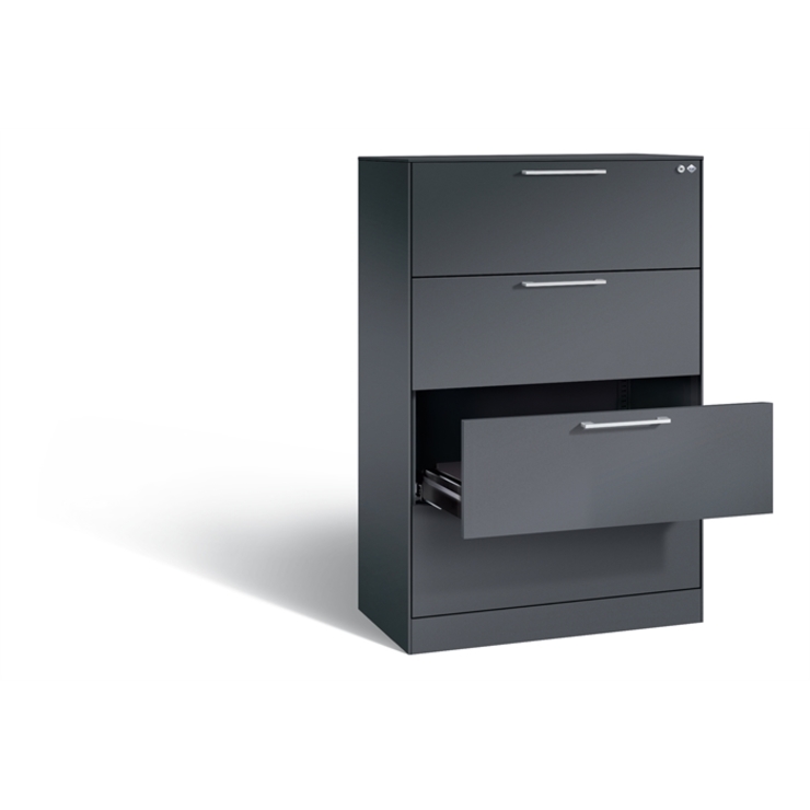 Stahl-Schubladenschrank Asisto, als Hängeregistraturschrank, Korpus aus stabiler Stahlkonstruktion, körperschallgedämpft für angenehmes Geräuschverhalten, mit filigraner Kantenoptik und hochwertiger Einbrennbeschichtung für hohe UV- Beständigkeit, mit integrierter Niveauregulierung von innen bedienbar, 4 voll ausziehbare Schubladen, 3-bahnig, für Hängehefter DIN A4, auf langlebigen Teleskopschienen mit Parallelsteuerung, End-Selbst-Einzug und Auszugsperre, hohe Traglast 50 Kg je... (mehr)? Papersmart hilft Ihnen, den besten Anbieter für Ihren gesamten Warenkorb zu ermitteln.