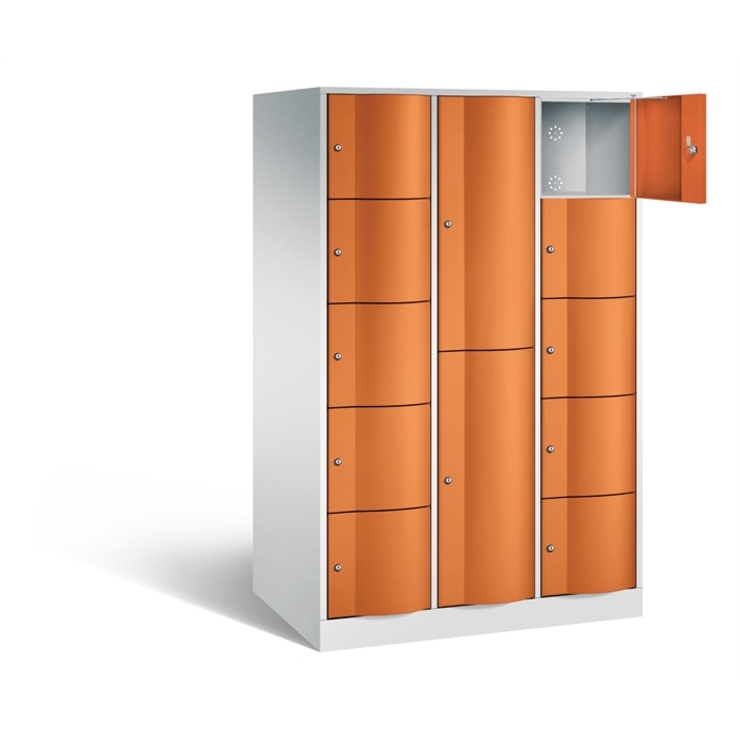 Stahl-Fächerschrank Classic, 3 Abteile mit 5 Fächern, Abteilbreite 300 mm, Korpus aus stabiler Stahlkonstruktion mit hochwertiger Einbrennbeschichtung für hohe UV- und Korrosionsbeständigkeit, auf 100 mm hohem Sockel, mit Kunststoffgleitern als praktischer Schrank- und Fußbodenschutz, vorne zurückgesetzt, 15 Zylinderschlösser mit je 2 Schlüsseln, Schließkreis bis 1000 verschiedene Schließungen, Türen mit Anschlagsdämpfer, Türaufhängung in Drehbolzen, Maße (H x B x T): 1800 x 900 x 500... (mehr)? Papersmart hilft Ihnen, den besten Anbieter für Ihren gesamten Warenkorb zu ermitteln.