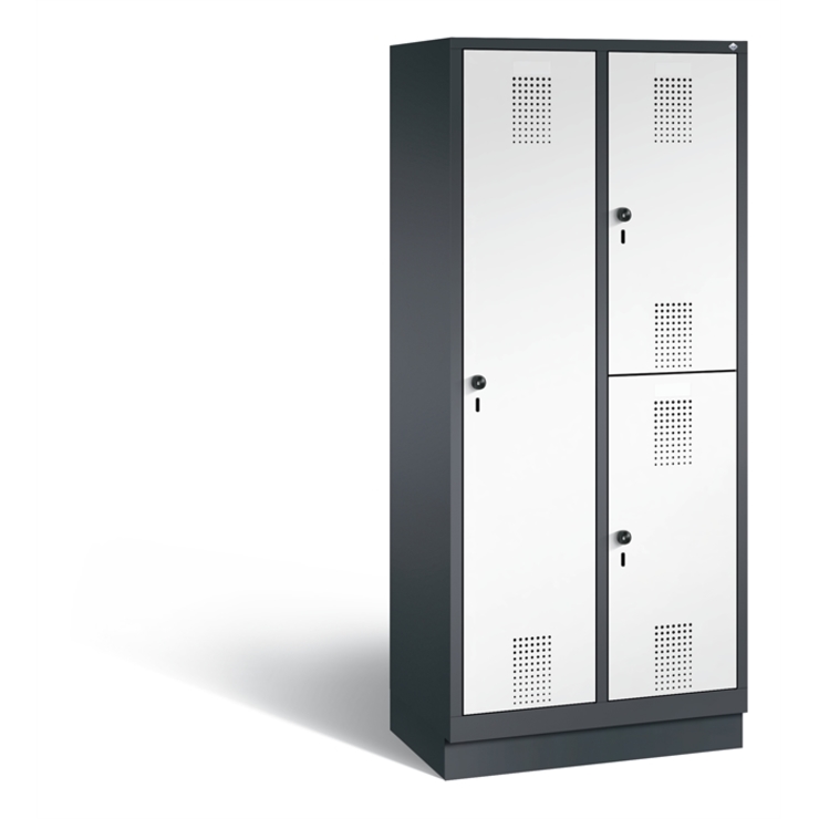 Doppelstöckiger Stahl-Garderobenschrank Evolo, 1 Abteil mit 2 Fächern, Abteilbreite 400 mm, Korpus aus stabiler Stahlkonstruktion mit hochwertiger Einbrennbeschichtung für hohe UV- und Korrosionsbeständigkeit, innen je Fach 1 stabile Garderobenstange aus Ovalprofil mit 3 verdrehsicheren Schiebehaken, auf 100 mm hohem Sockel, mit Kunststoffgleitern als praktischer Schrank- und Fußbodenschutz, vorne zurückgesetzt, 2 Ergonomische Sicherheits-Drehriegel für Vorhängeschlösser inkl.... (mehr)? Papersmart hilft Ihnen, den besten Anbieter für Ihren gesamten Warenkorb zu ermitteln.