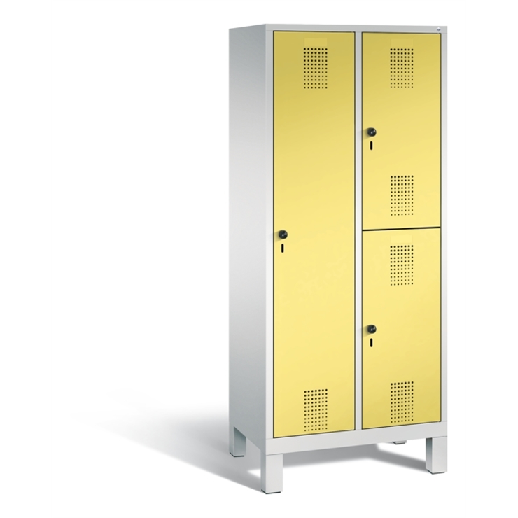 Stahl-Garderobenschrank Evolo, als Kombinationsschrank, 2 Abteile, Abteilbreite 400 mm, rechtes Abteil mit 2 Fächern, Korpus aus stabiler Stahlkonstruktion mit hochwertiger Einbrennbeschichtung für hohe UV- und Korrosionsbeständigkeit, linkes Abteil innen mit 1 Ablageboden, darunter 1 stabile Garderobenstange aus Ovalprofil mit 3 verdrehsicheren Schiebehaken, rechtes Abteil innen je Fach 1 stabile Garderobenstange aus Ovalprofil mit 3 verdrehsicheren Schiebehaken, Schrankboden hinten mit großflächigem Luftdurchlass für optimale Luftzirkulation, auf 150 mm hohen Füßen aus Kunststoff für erweiterten Korrosionsschutz, mit integrierter Niveauregulierung und Schutzhülsen zur stilvollen Abdeckung der Verstellschrauben, bequem von innen und außen verstellbar, 3 Ergonomische Sicherheits-Drehriegel für Vorhängeschlösser inkl. Tür-Schutz, Türen mit Anschlagsdämpfer und geschlossenen Seitenprofilen für höchste Stabilität und Einbruchsicherheit, mit reinigungsfreundlichem Belüftungslochbild oben und unten sowie eingeprägtem Etikettenrahmen, Türaufhängung in Drehbolzen, Maße (H x B x T): 1850 x 810 x 500 mm, Korpus: RAL 7035 Lichtgrau, Türen Stahl: 0959059 RDS Schwefelgelb, Füße: RAL 7035 Lichtgrau