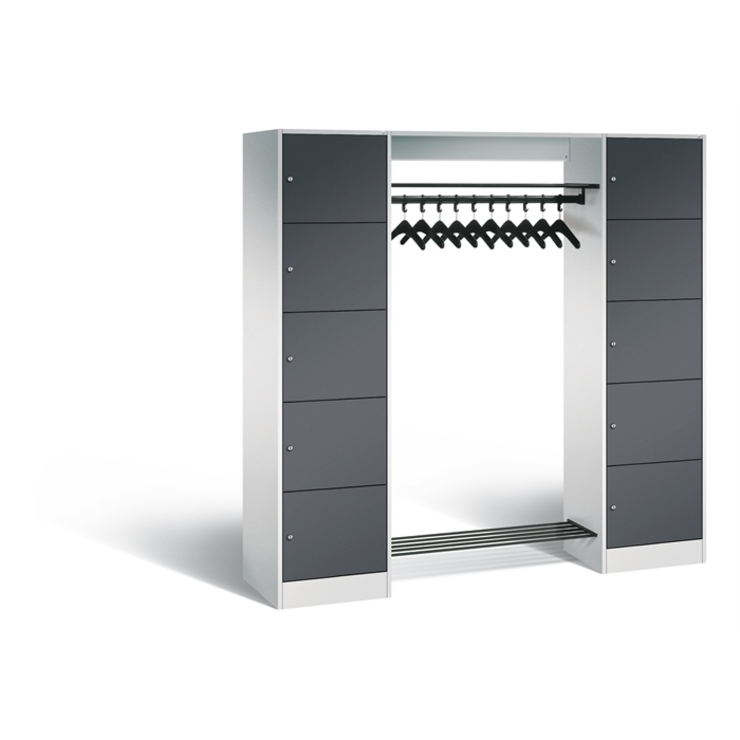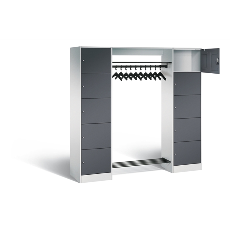 Offene Garderobe Serie 8070, bestehend aus 2 Fächerschränken mit je 5 Fächern, Korpus aus stabiler Stahlkonstruktion mit hochwertiger Einbrennbeschichtung für hohe UV- und Korrosionsbeständigkeit, Türen doppelwandig für hohe Stabilität, Türaufhängung oben und unten in Drehbolzen, rechts angeschlagen, inkl. Türöffnungsbegrenzer 90 Grad, als Schutz vor Überdehnen der Tür, auf 100 mm hohem Sockel, dazwischen Garderobenteil mit Kopfboden, darunter Ablageboden aus Rundrohr sowie 1 stabile Garderobenstange aus Ovalprofil und 10 verdrehsicheren Schiebehaken, unten 1 Schuhrost aus Rundrohr, 10 Zylinderschlösser mit je 2 Schlüsseln, Schließkreis bis 1000 verschiedene Schließungen, 10 Kleiderbügel aus Hartholz, schwarz lackiert mit Spezialaufhängung, Maße (H x B x T): 1950 x 1870 x 480 mm, Korpus: RAL 7035 Lichtgrau, Türen: RAL 7021 Schwarzgrau, Zwischenteil: RAL 7021 Schwarzgrau, Sockel: RAL 7021 Schwarzgrau