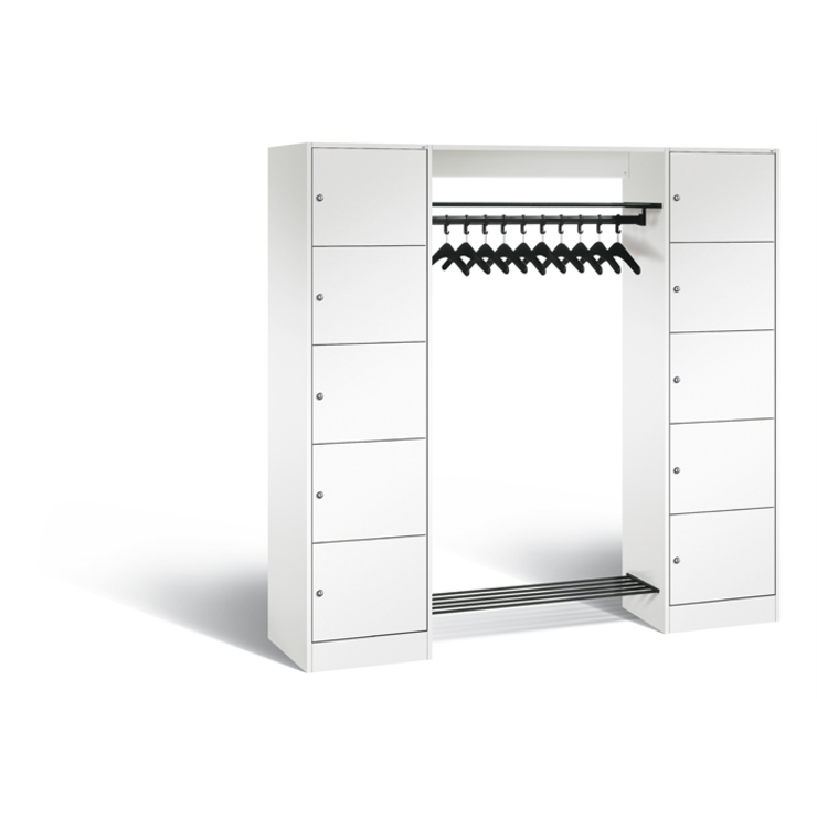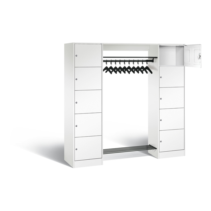 Offene Garderobe Serie 8070, bestehend aus 2 Fächerschränken mit je 5 Fächern, Korpus aus stabiler Stahlkonstruktion mit hochwertiger Einbrennbeschichtung für hohe UV- und Korrosionsbeständigkeit, Türen doppelwandig für hohe Stabilität, Türaufhängung oben und unten in Drehbolzen, rechts angeschlagen, inkl. Türöffnungsbegrenzer 90 Grad, als Schutz vor Überdehnen der Tür, auf 100 mm hohem Sockel, dazwischen Garderobenteil mit Kopfboden, darunter Ablageboden aus Rundrohr sowie 1 stabile... (mehr)? Papersmart hilft Ihnen, den besten Anbieter für Ihren gesamten Warenkorb zu ermitteln.