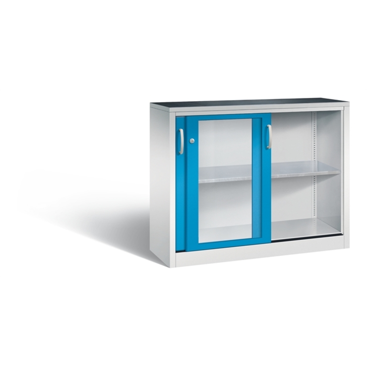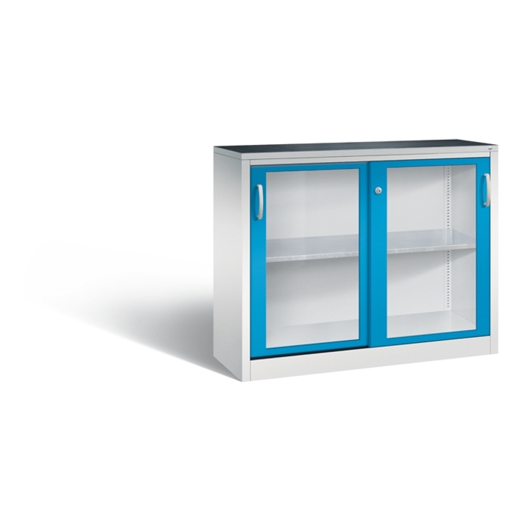 Stahl-Schiebetürenschrank Acurado-2000, Korpus aus stabiler Stahlkonstruktion mit hochwertiger Einbrennbeschichtung für hohe UV-Beständigkeit, mit Kunststoffgleitern als praktischer Schrank- und Fußbodenschutz, hohe Flexibilität der Inneneinrichtung durch Höhenverstellbarkeit im 15 mm Raster, Türen mit Sichtfenster aus Acrylglas für direkten Einblick, mit geschlossenen Seitenprofilen für höchste Stabilität, leichtgängige Bedienung durch Leichtlaufrollen in spezieller Schienenführung, 1 Wechselzylinder matt vernickelt mit 2 Schlüsseln, 2 Ergonomische Bügelgriffe Ergolock aus Metall für einfache Bedienung, matt vernickelt, 1 Einlegeboden aus Stahl, verzinkt, mit hoher Traglast 70 kg, 1 Gummiriefenmatte, Maße (H x B x T): 1000 x 1200 x 400 mm, Korpus: RAL 7035 Lichtgrau, Türen: RAL 5012 Lichtblau