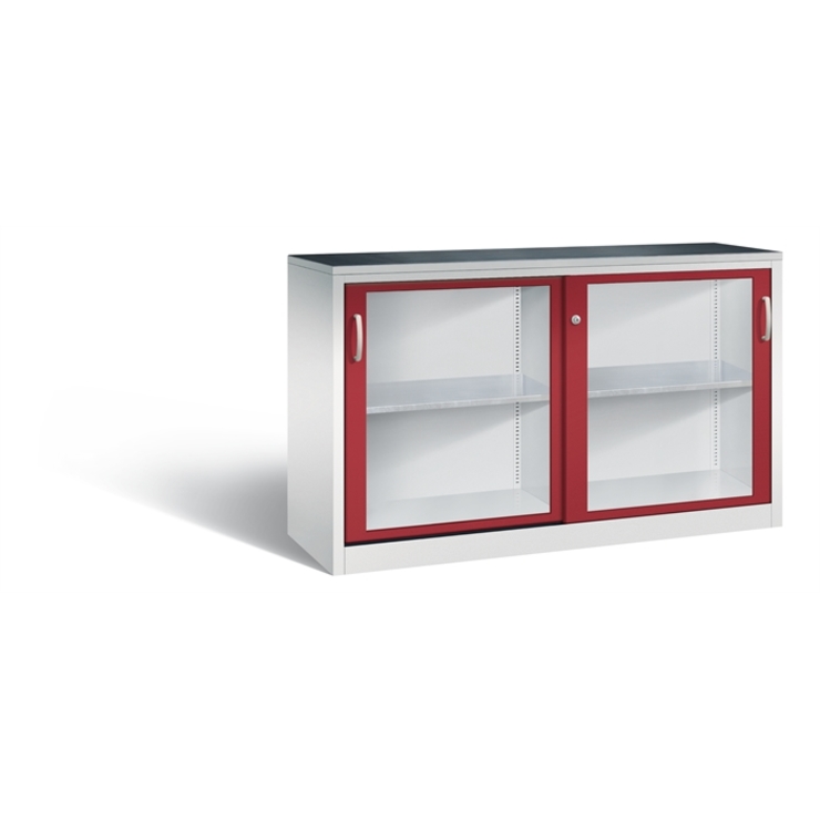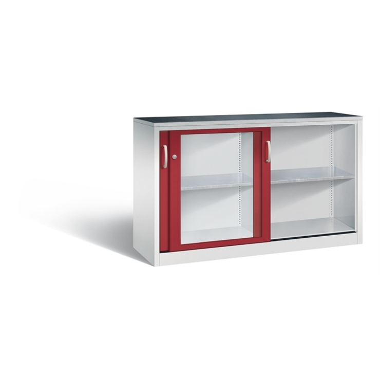 Stahl-Schiebetürenschrank Acurado-2000, Korpus aus stabiler Stahlkonstruktion mit hochwertiger Einbrennbeschichtung für hohe UV-Beständigkeit, mit Kunststoffgleitern als praktischer Schrank- und Fußbodenschutz, hohe Flexibilität der Inneneinrichtung durch Höhenverstellbarkeit im 15 mm Raster, Türen mit Sichtfenster aus Acrylglas für direkten Einblick, mit geschlossenen Seitenprofilen für höchste Stabilität, leichtgängige Bedienung durch Leichtlaufrollen in spezieller Schienenführung, 1 Wechselzylinder matt vernickelt mit 2 Schlüsseln, 2 Ergonomische Bügelgriffe Ergolock aus Metall für einfache Bedienung, matt vernickelt, 2 Einlegeböden aus Stahl, verzinkt, mit hoher Traglast 70 kg, 1 inkl. Gummiriefenmatte zur Auflage auf den Schrank, selbstklebend, Maße (H x B x T): 1000 x 1600 x 500 mm, Korpus: RAL 7035 Lichtgrau, Türen: RAL 3003 Rubinrot