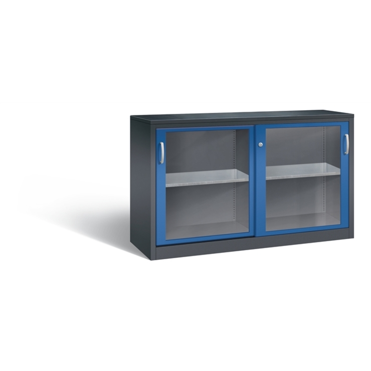 Stahl-Schiebetürenschrank Acurado-2000, Korpus aus stabiler Stahlkonstruktion mit hochwertiger Einbrennbeschichtung für hohe UV-Beständigkeit, mit Kunststoffgleitern als praktischer Schrank- und Fußbodenschutz, hohe Flexibilität der Inneneinrichtung durch Höhenverstellbarkeit im 15 mm Raster, Türen mit Sichtfenster aus Acrylglas für direkten Einblick, mit geschlossenen Seitenprofilen für höchste Stabilität, leichtgängige Bedienung durch Leichtlaufrollen in spezieller Schienenführung, 1 Wechselzylinder matt vernickelt mit 2 Schlüsseln, 2 Ergonomische Bügelgriffe Ergolock aus Metall für einfache Bedienung, matt vernickelt, 2 Einlegeböden aus Stahl, verzinkt, mit hoher Traglast 70 kg, 1 inkl. Gummiriefenmatte zur Auflage auf den Schrank, selbstklebend, Maße (H x B x T): 1000 x 1600 x 500 mm, Korpus: RAL 7021 Schwarzgrau, Türen: RAL 5010 Enzianblau