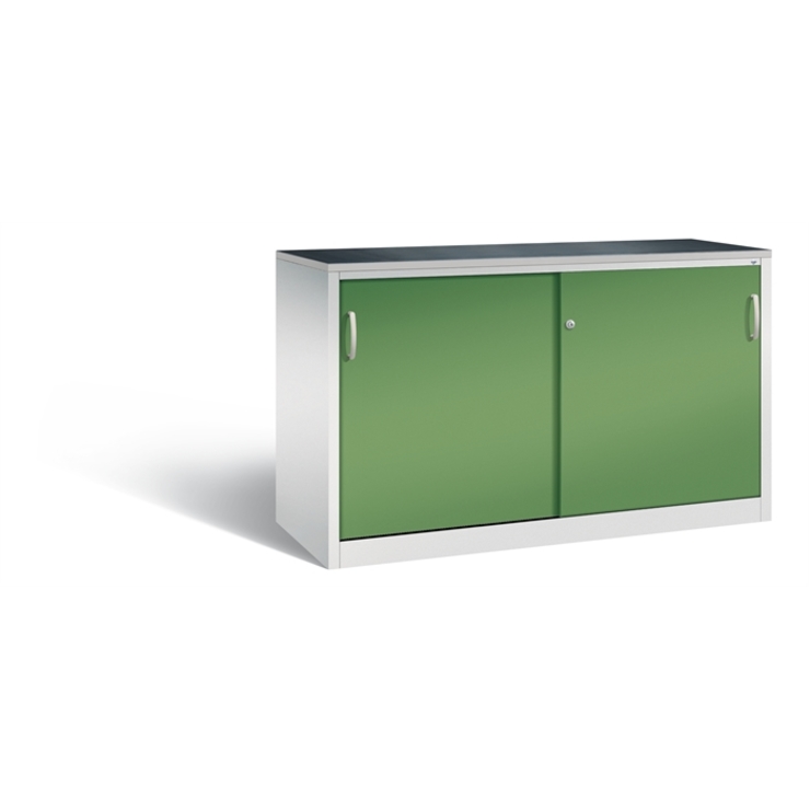 Stahl-Schiebetürenschrank Acurado-2000, Korpus aus stabiler Stahlkonstruktion mit hochwertiger Einbrennbeschichtung für hohe UV-Beständigkeit, mit Kunststoffgleitern als praktischer Schrank- und Fußbodenschutz, hohe Flexibilität der Inneneinrichtung durch Höhenverstellbarkeit im 15 mm Raster, Türen verstärkt für hohe Stabilität, leichtgängige Bedienung durch Leichtlaufrollen in spezieller Schienenführung, mit Mitteltrennwand, 1 Wechselzylinder matt vernickelt mit 2 Schlüsseln, 2 Ergonomische Bügelgriffe Ergolock aus Metall für einfache Bedienung, matt vernickelt, 2 Einlegeböden aus Stahl, verzinkt, mit hoher Traglast 70 kg, 1 Gummiriefenmatte, Maße (H x B x T): 1000 x 1600 x 600 mm, Korpus: RAL 7035 Lichtgrau, Türen: RAL 6011 Resedagrün