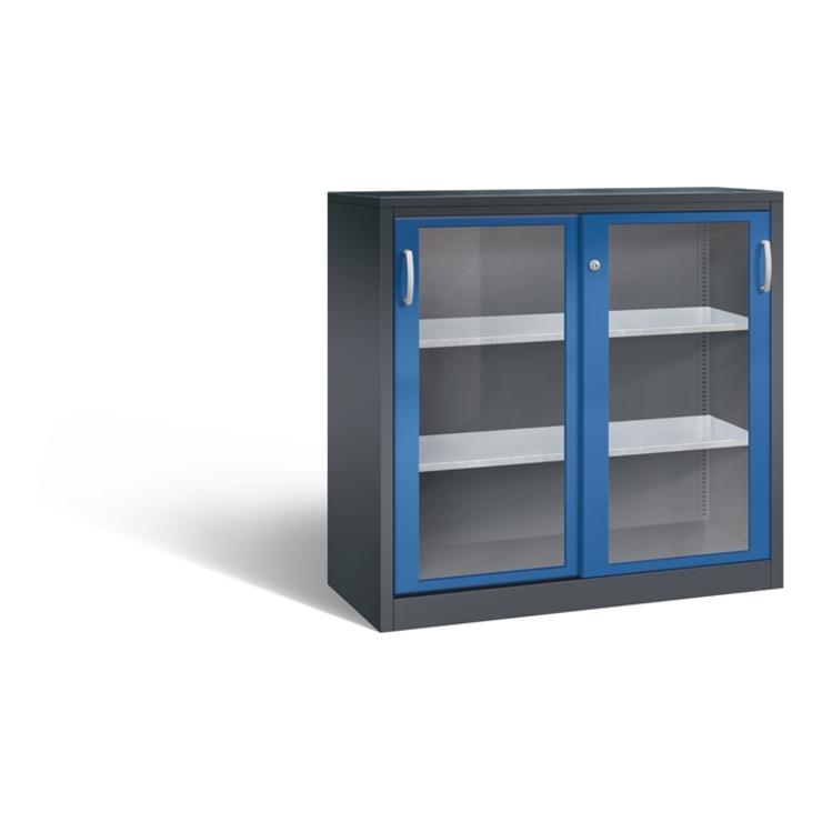 Stahl-Schiebetürenschrank Acurado-2000, Korpus aus stabiler Stahlkonstruktion mit hochwertiger Einbrennbeschichtung für hohe UV-Beständigkeit, mit Kunststoffgleitern als praktischer Schrank- und Fußbodenschutz, hohe Flexibilität der Inneneinrichtung durch Höhenverstellbarkeit im 15 mm Raster, Türen mit Sichtfenster aus Acrylglas für direkten Einblick, mit geschlossenen Seitenprofilen für höchste Stabilität, leichtgängige Bedienung durch Leichtlaufrollen in spezieller Schienenführung, 1 Wechselzylinder matt vernickelt mit 2 Schlüsseln, 2 Ergonomische Bügelgriffe Ergolock aus Metall für einfache Bedienung, matt vernickelt, 2 Einlegeböden aus Stahl, verzinkt, mit hoher Traglast 70 kg, 1 inkl. Gummiriefenmatte zur Auflage auf den Schrank, selbstklebend, Maße (H x B x T): 1200 x 1200 x 500 mm, Korpus: RAL 7021 Schwarzgrau, Türen: RAL 5010 Enzianblau