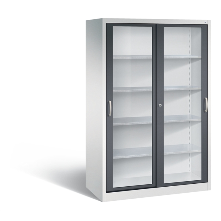 Stahl-Schiebetürenschrank Acurado-2000, Korpus aus stabiler Stahlkonstruktion mit hochwertiger Einbrennbeschichtung für hohe UV-Beständigkeit, mit Kunststoffgleitern als praktischer Schrank- und Fußbodenschutz, hohe Flexibilität der Inneneinrichtung durch Höhenverstellbarkeit im 15 mm Raster, Türen mit Sichtfenster aus Acrylglas für direkten Einblick, mit geschlossenen Seitenprofilen für höchste Stabilität, leichtgängige Bedienung durch Leichtlaufrollen in spezieller Schienenführung, 1 Wechselzylinder matt vernickelt mit 2 Schlüsseln, 2 Ergonomische Bügelgriffe Ergolock aus Metall für einfache Bedienung, matt vernickelt, 4 Einlegeböden aus Stahl, verzinkt, mit hoher Traglast 70 kg, Maße (H x B x T): 1950 x 1200 x 600 mm, Korpus: RAL 7035 Lichtgrau, Türen: RAL 7021 Schwarzgrau