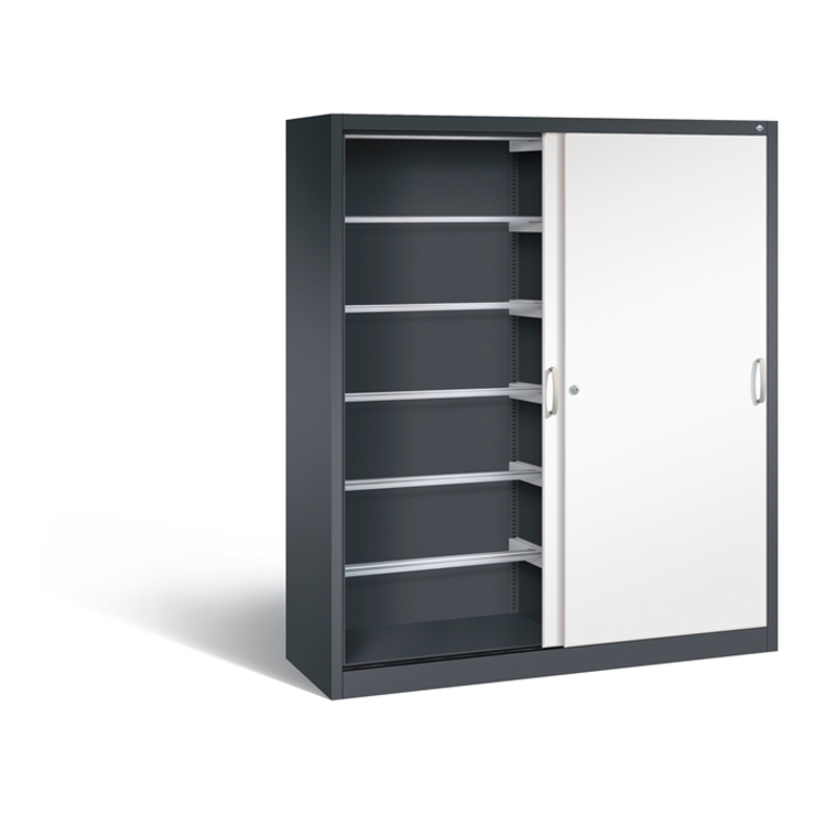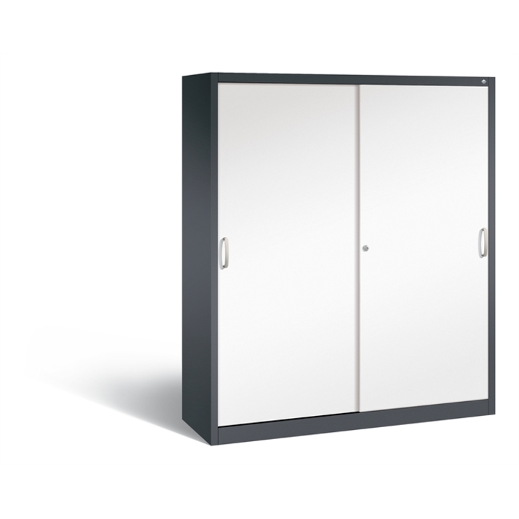 Stahl-Schiebetürenschrank Asisto, Korpus aus stabiler Stahlkonstruktion mit filigraner Kantenoptik und hochwertiger Einbrennbeschichtung für hohe UV-Beständigkeit, mit integrierter Niveauregulierung, bequem von innen bedienbar, hohe Flexibilität der Inneneinrichtung durch Höhenverstellbarkeit im 15 mm Raster, 1 Wechselzylinder matt vernickelt mit 2 Schlüsseln, 2 Ergonomische Design-Bügelgriffe für einfache Bedienung, aus Metall, matt vernickelt, 1 Abdeckplatte aus Stahl, 2 Stahltüren... (mehr)? Papersmart hilft Ihnen, den besten Anbieter für Ihren gesamten Warenkorb zu ermitteln.