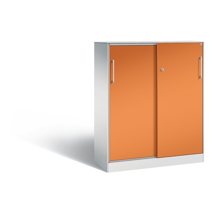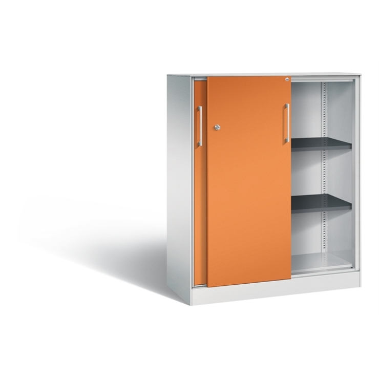 Stahl-Schiebetürenschrank Asisto, Korpus aus stabiler Stahlkonstruktion mit filigraner Kantenoptik und hochwertiger Einbrennbeschichtung für hohe UV-Beständigkeit, mit integrierter Niveauregulierung, bequem von innen bedienbar, hohe Flexibilität der Inneneinrichtung durch Höhenverstellbarkeit im 15 mm Raster, 1 Wechselzylinder matt vernickelt mit 2 Schlüsseln, 2 Ergonomische Design-Bügelgriffe für einfache Bedienung, aus Metall, matt vernickelt, 1 Abdeckplatte aus Stahl, 2 Stahltüren doppelwandig, gedämmt für angenehmes Geräuschverhalten, leichtgängige Bedienung durch Leichtlaufrollen in spezieller Schienenführung, 2 Einlegeböden aus Stahl lackiert, mit hoher Traglast von 70 kg, Maße (H x B x T): 1310 x 1000 x 435 mm, Korpus: RAL 7035 Lichtgrau, Türen: RAL 2000 Gelborange, Inneneinrichtung: RAL 7021 Schwarzgrau
