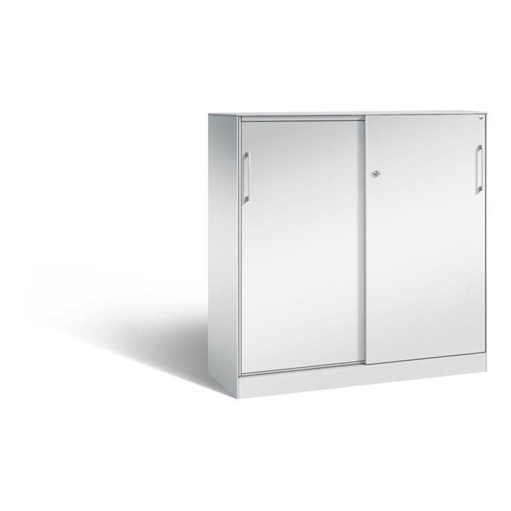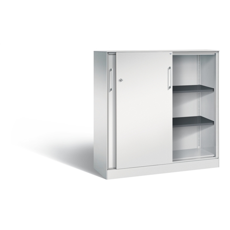 Stahl-Schiebetürenschrank Asisto, Korpus aus stabiler Stahlkonstruktion mit filigraner Kantenoptik und hochwertiger Einbrennbeschichtung für hohe UV-Beständigkeit, mit integrierter Niveauregulierung, bequem von innen bedienbar, hohe Flexibilität der Inneneinrichtung durch Höhenverstellbarkeit im 15 mm Raster, 1 Wechselzylinder matt vernickelt mit 2 Schlüsseln, 2 Ergonomische Design-Bügelgriffe für einfache Bedienung, aus Metall, matt vernickelt, 1 Abdeckplatte aus Stahl, 2 Stahltüren doppelwandig, gedämmt für angenehmes Geräuschverhalten, leichtgängige Bedienung durch Leichtlaufrollen in spezieller Schienenführung, 2 Einlegeböden aus Stahl lackiert, mit hoher Traglast von 70 kg, Maße (H x B x T): 1310 x 1200 x 435 mm, Korpus: RAL 7035 Lichtgrau, Türen: RAL 7035 Lichtgrau, Inneneinrichtung: RAL 7021 Schwarzgrau